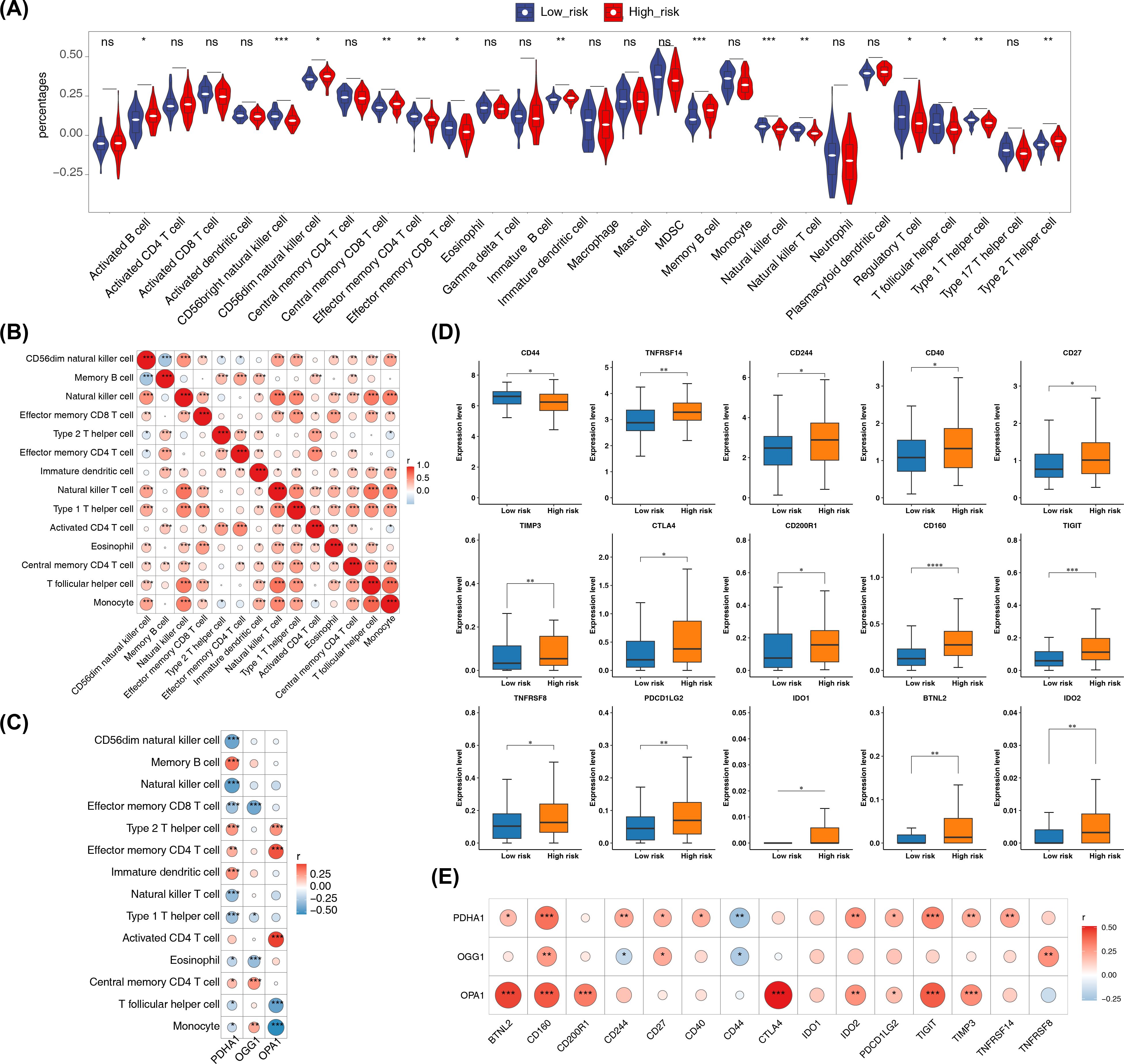 (A) Violin plot comparing cell type percentages between low-risk and high-risk groups with significant differences marked. (B) Correlation matrix showing relationships among various immune cells, color-coded by correlation strength. (C) Dot plot correlating immune cell types with specific genes OPA1, OGG1, and PDHA1, indicated by color intensity. (D) Box plots presenting expression levels of genes CD44, TNFRSF14, CD200R1, and others between low-risk and high-risk groups, displaying significant differences. (E) Dot plot correlating gene expressions with PDHA1, OGG1, and OPA1, indicated by color and size.