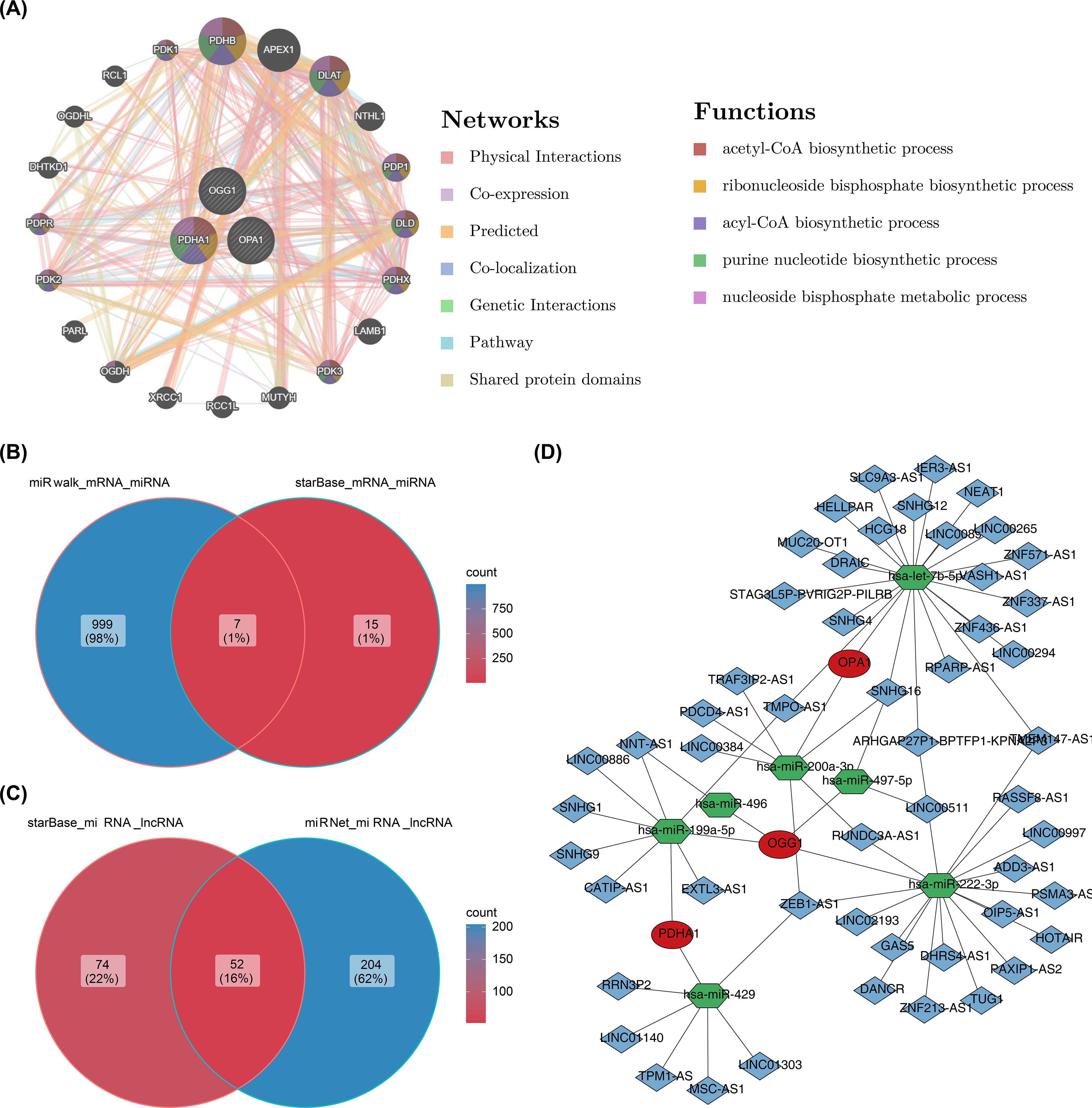(A) A network graph showing various proteins connected by lines, indicating different types of interactions such as physical, co-expression, and predicted. Key for colors categorizes interactions and functions. (B) A Venn diagram comparing miRWalk mRNA-miRNA and starBase mRNA-miRNA databases, showing overlap. (C) A Venn diagram comparing starBase miRNA-lncRNA and miRNet miRNA-lncRNA databases, indicating overlap. (D) A network diagram displaying interactions among various genetic elements, with miRNA and genes labeled.