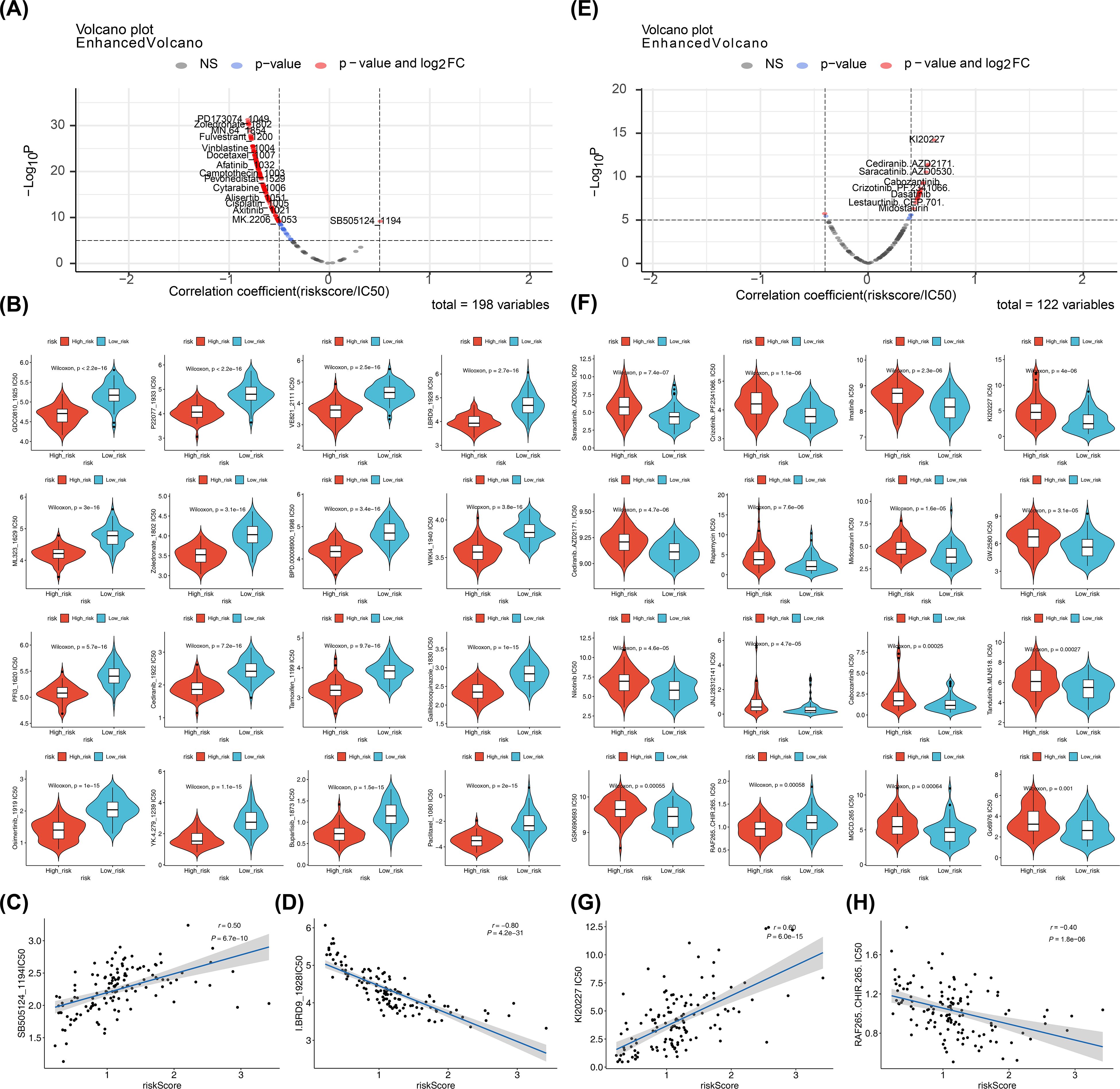 Volcano plots (A, E) show the correlation coefficient between risk score and IC50 for various variables. Violin plots (B, F) illustrate variable distribution comparisons, divided into red and blue categories with statistical values. Scatter plots (C, D, G, H) depict relationships between specific variables and risk scores, along with correlation coefficients and significance levels.