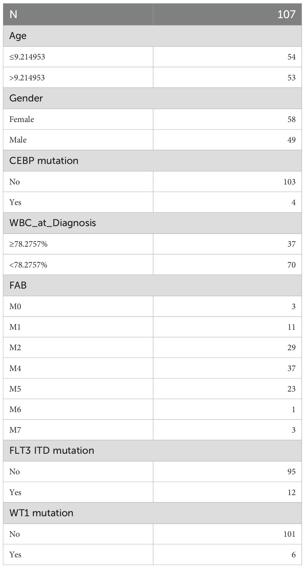 Acute myeloid leukemia (AML) is a heterogeneous malignancy characterized by disrupted hematopoietic stem cell regulation and impaired differentiation, accounting for 15–20% of childhood leukemia cases (1, 2). Pediatric AML is associated with a poor prognosis, with a long-term survival rate of only 45–55% and a recurrence rate of approximately 30% (3, 4). The primary treatment strategies for AML include chemotherapy and hematopoietic stem cell transplantation (HSCT) (5). In pediatric AML, however, the failure rate of initial induction remission therapy is 10–15%, and only about one-third of patients with induction failure achieve eventual cure (6). This suboptimal prognosis is largely due to the inability to maintain disease remission after initial therapy. Chemotherapy causes significant toxicity, including myelosuppression, heightened infection risk, and long-term organ damage (7). Although allogeneic HSCT offers potential curative benefits, it carries risks such as graft-versus-host disease, opportunistic infections, and transplant-related mortality (8). Thus, identifying prognostic biomarkers and developing novel predictive models are crucial for the clinical management of pediatric AML. These efforts could yield new therapeutic targets, ultimately improving treatment outcomes.