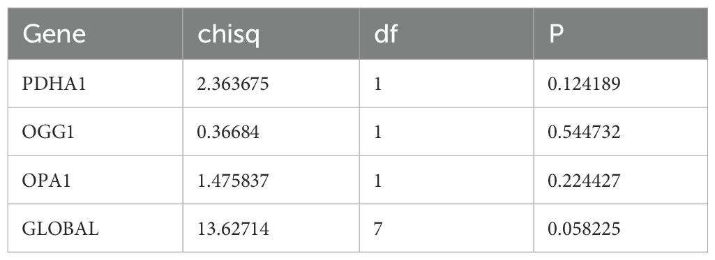 Based on 26 candidate genes, this study further explored which genes hold significant prognostic value for survival outcomes in pediatric AML. Using 131 samples from TARGET-AML (the data was randomly split into a training set of 131 cases and a test set of 56 cases in a 7:3 ratio), through univariate Cox regression analysis, 7 candidate prognostic genes were identified, among which these genes were all considered as high risk genes (HR > 1) (Figure 2A). Multivariate Cox regression analysis and the PH assumption test (p > 0.05) further confirmed 3 potential prognostic genes—PDHA1, OGG1, and OPA1—as significant (Figure 2B; Table 2).