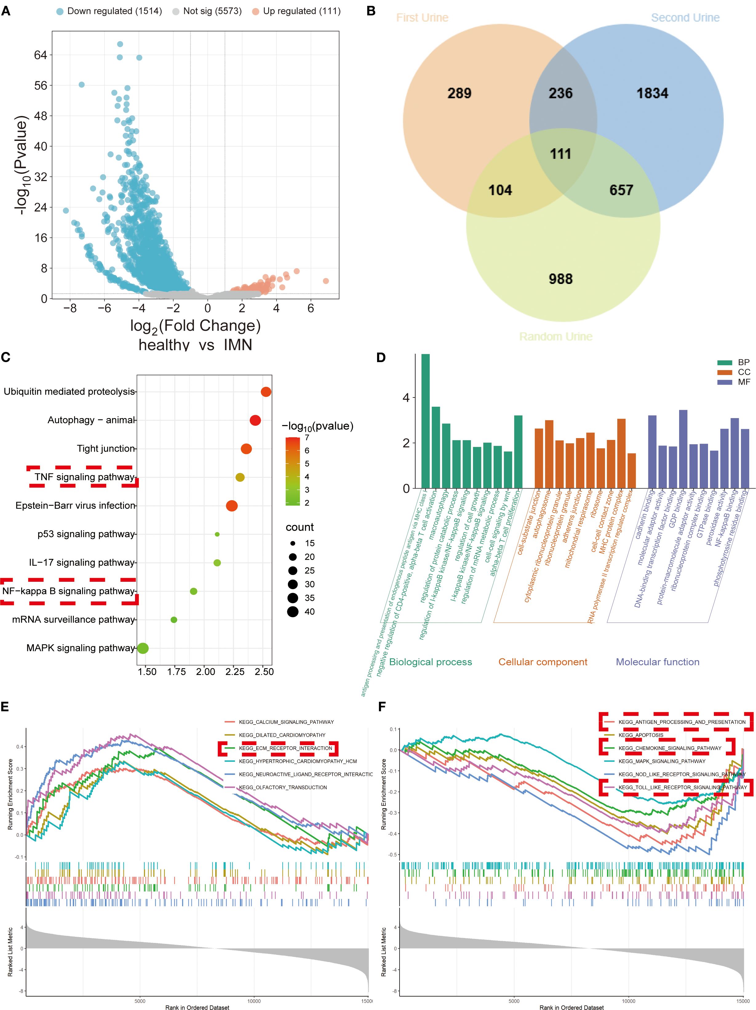 Figure 1. DEGs’ expression and functional enrichment analysis of urinary exfoliated cells from IMN patients versus healthy volunteers across three sample types. (A) Volcano plot displaying integrated DEGs from all three urine samples. (B) Venn diagram illustrating overlapping DEGs among sample types. (C) KEGG pathway analysis demonstrating significant associations of DEGs with inflammatory and fibrotic responses. (D) GO analysis categorizing DEGs into biological processes (BP), cellular components (CC), and molecular functions (MF). (E, F) GSEA of downregulated and upregulated gene sets, respectively.