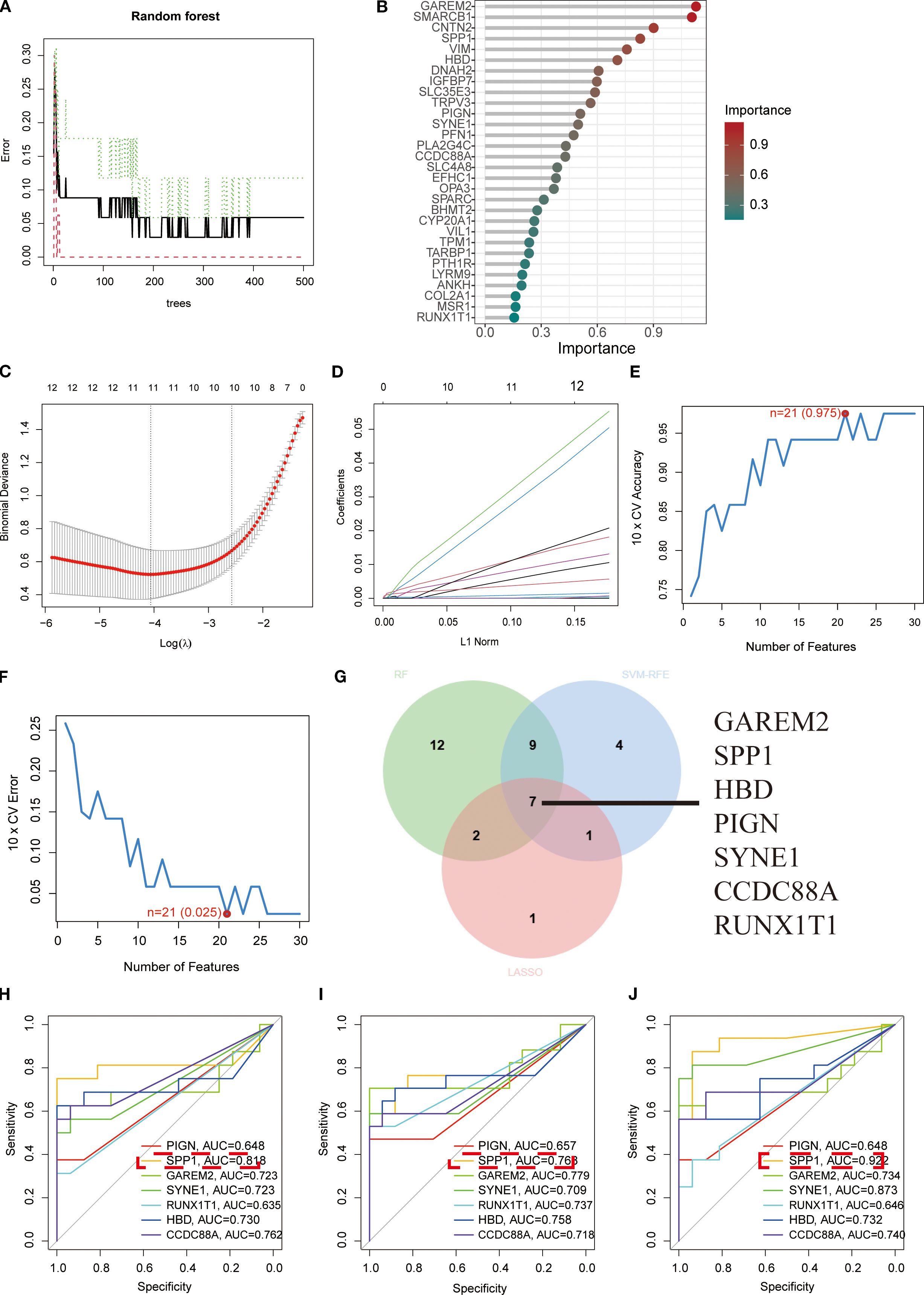 Figure 2. Screening of key biomarkers. (A, B) Feature importance identification using Random Forest algorithm. (C, D) Coefficient trajectory plot and cross-validation curve from LASSO logistic regression analysis. (E, F) Prediction accuracy and error variation curves for each gene in SVM algorithm. (G) Venn diagram displaying overlapping diagnostic biomarkers identified by all three algorithms. (H-J) ROC curves demonstrating diagnostic efficacy of the seven key biomarkers in first-void morning urine, second-void morning urine, and random urine samples, respectively, where higher AUC values indicate stronger correlations and better diagnostic performance.