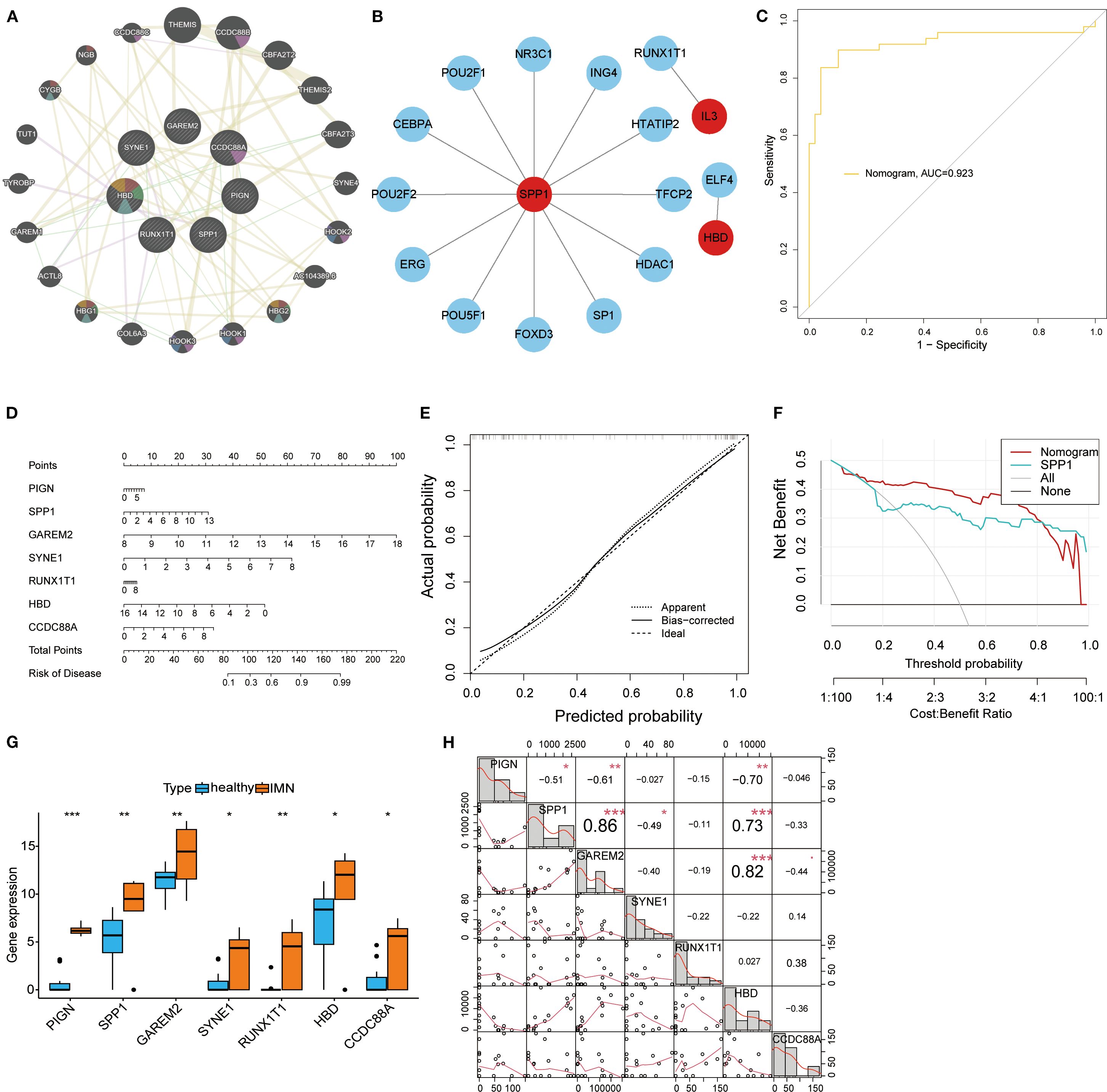 Figure 3. Transcriptional regulatory networks and diagnostic performance evaluation of key biomarkers. (A) PPI network of the seven key biomarkers. (B) Transcriptional regulatory networks of SPP1, RUNX1T1, and HBD identified through TRRUST database analysis. (C) ROC curve of the nomogram model, where higher AUC values indicate greater model reliability. (D) The nomogram visually demonstrates the association between key biomarkers and disease risk, with the length of each variable’s axis (i.e., scale markers) being proportional to its contribution to the outcome. (E) Calibration curve analysis of the nomogram model: Apparent represents the model’s predictive performance on the training set; Bias-corrected shows the relationship between predicted and actual probabilities after bias correction; Ideal indicates perfect alignment between predicted and actual probabilities. (F) Decision curve analysis for the SPP1 biomarker. (G) Box plots displaying expression levels of all key biomarkers. (H) Correlation analysis of DEGs: the lower left quadrant shows bivariate scatter plots with fitted lines, while the upper right quadrant displays correlation coefficients and significance levels (*P < 0.05, **P < 0.01, ***P < 0.001).