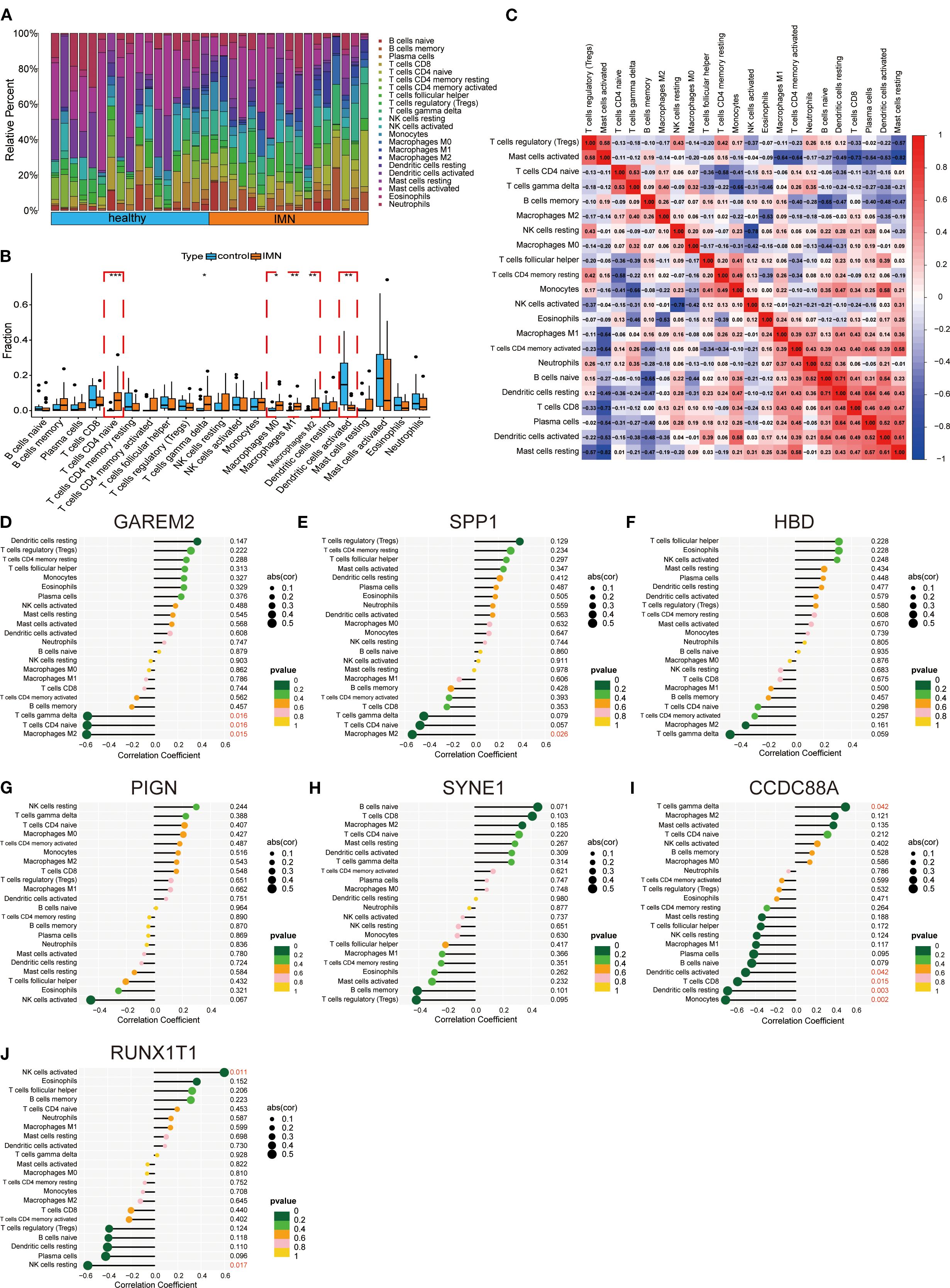 Figure 4. Immune infiltration and immune cell correlation analysis of key factors. (A, B) Immune cell infiltration between IMN and normal controls. (C) Heatmap of correlations between immune cells. (D-J) Lollipop plots showing correlations between hub genes and immune cells.