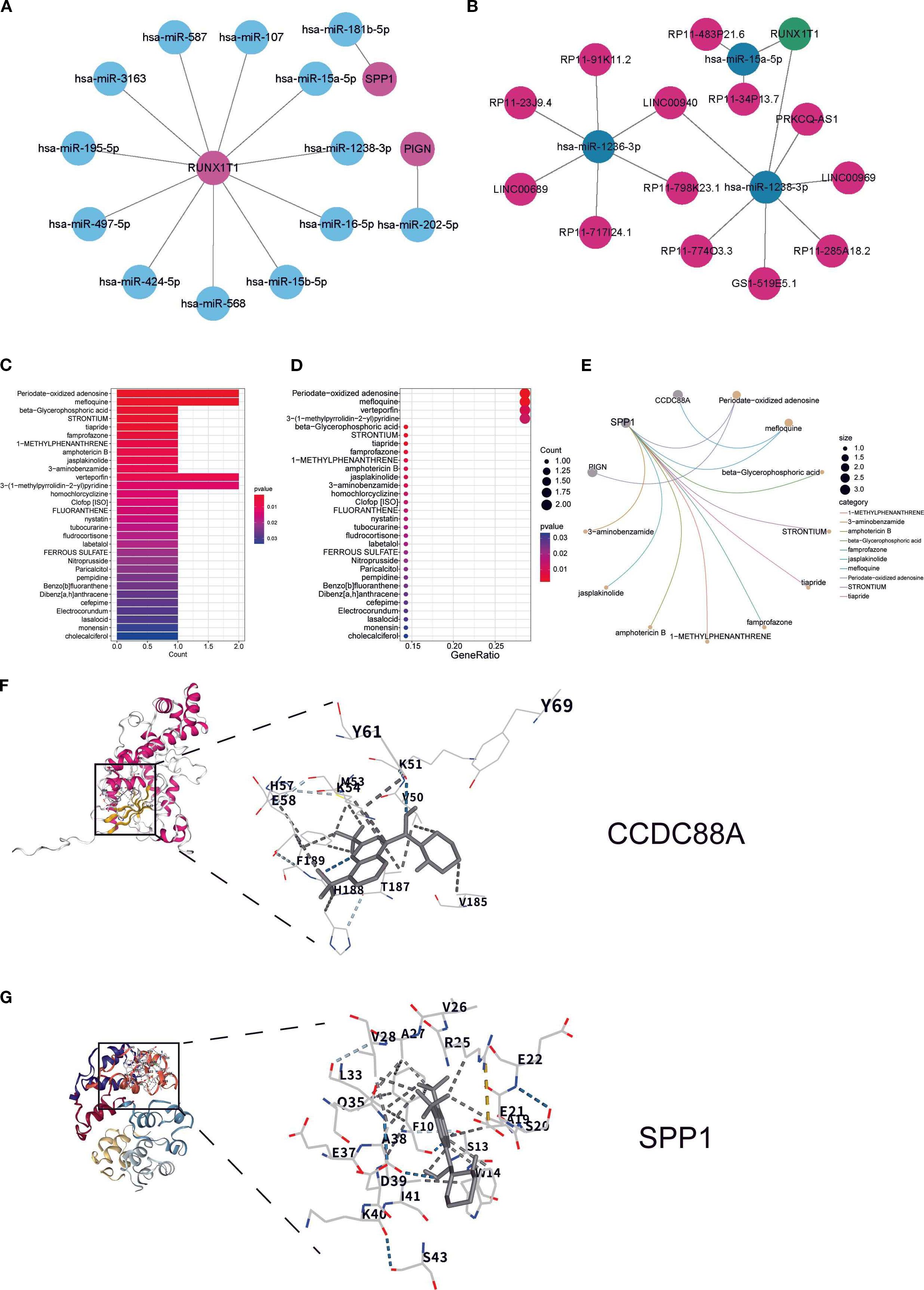 Figure 5. Regulatory factors and drug targets of key biomarkers: (A) miRNA regulatory network of key biomarkers; (B) lncRNA and ceRNA regulatory network of key biomarkers; (C, D) Box plot and bubble plot showing predicted drug binding sites; (E) Network diagram illustrating specific drug-biomarker interactions, where circular nodes represent key biomarkers and connecting lines indicate existing associations or interactions between drugs and biomarkers. (F, G) Molecular docking analysis showing the binding sites of CCDC88A and SPP1 with mefloquine.