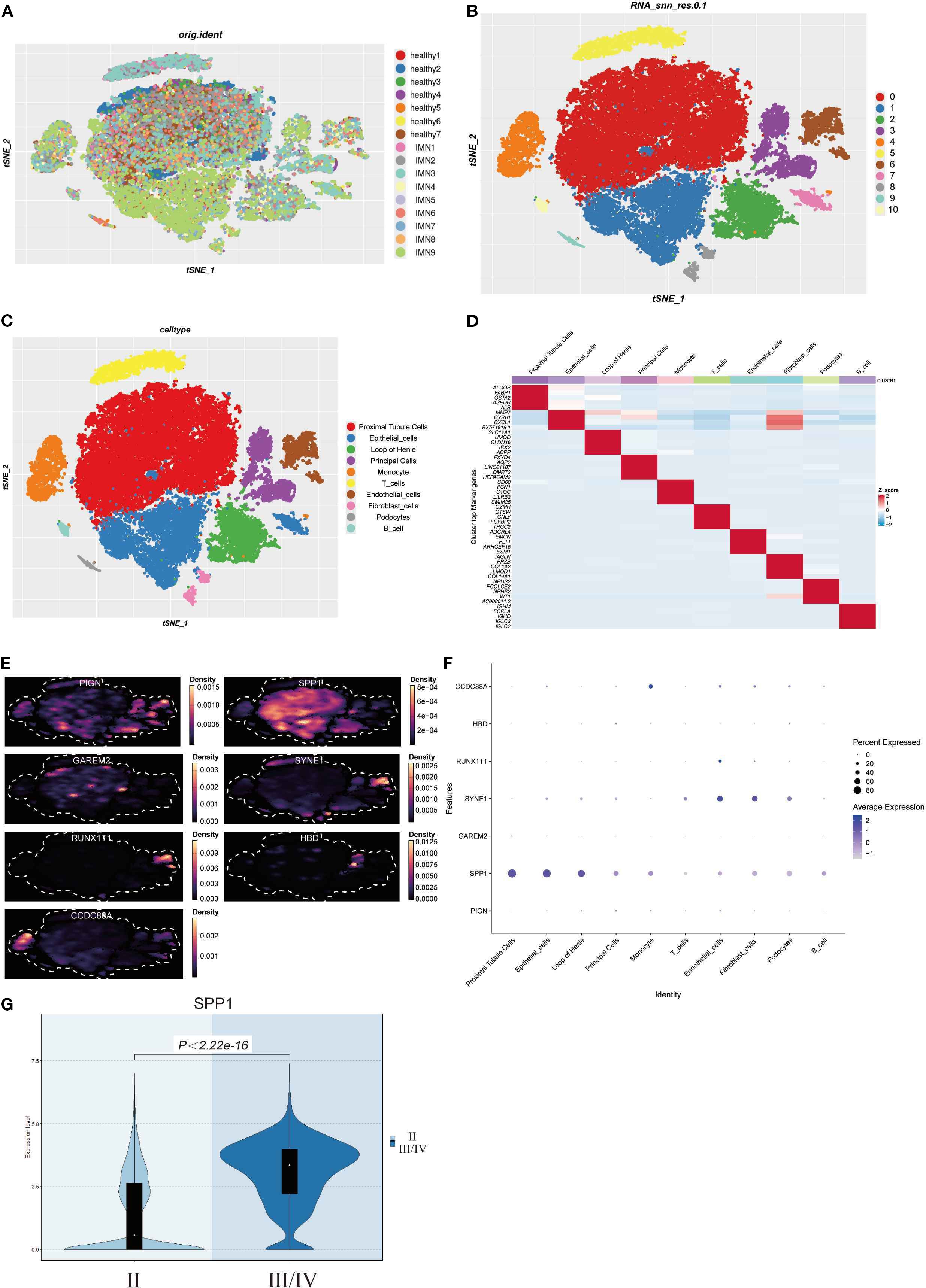 Figure 6. Construction of IMN single-cell atlas and cellular localization of differentially expressed genes: (A) Integration of scRNA-seq data from renal tissues of 9 IMN patients and 7 healthy controls; (B, C) Cell clustering into 10 distinct populations based on marker gene expression; (D) Marker genes of each cell cluster are shown as a heatmap, with color intensity indicating their relative expression; (E, F) Density plots and bubble charts visualizing distribution patterns of differentially expressed genes across cell clusters - in density plots, color intensity correlates positively with cellular distribution density (darker shades indicate higher cell density), while in bubble charts, bubble size is proportional to cell numbers (larger bubbles represent greater cell quantities); (G) Violin plot analysis demonstrating significantly elevated SPP1 expression in stage III/IV pathological samples compared to earlier stages.