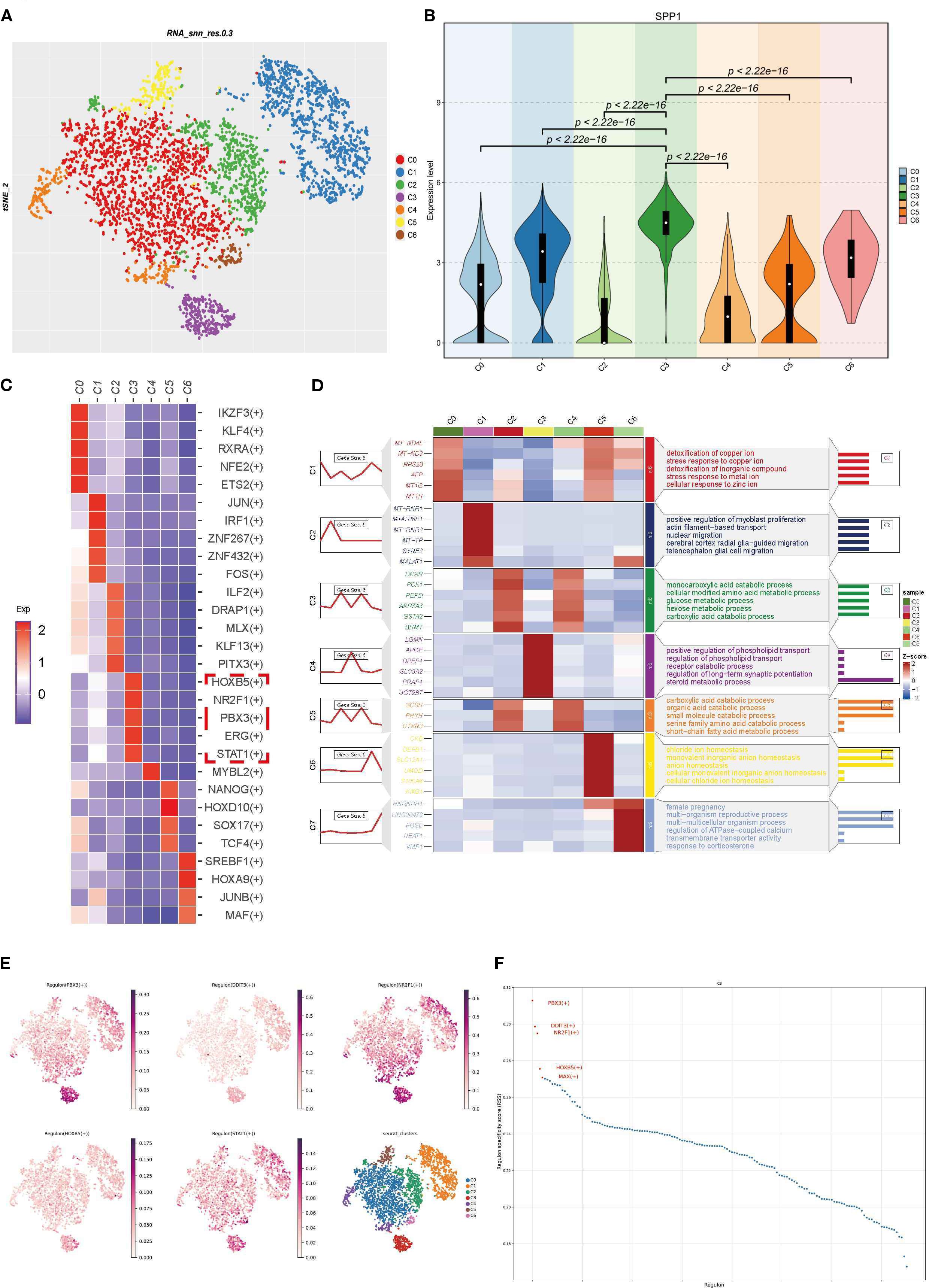 Figure 7. Functional exploration and transcriptional regulatory factor analysis of SPP1-high expressing PTCs clusters: (A) PTCs were reclassified into 7 clusters with a resolution of 0.1; (B) Violin plot showing high SPP1 expression in cluster C3; (C) Heatmap of transcription factors with high specificity for each cluster, calculated by RSS; (D) Heatmap visualizing characteristic marker gene expression and corresponding GO enrichment analysis results; (E) TSNE plot displaying transcription factor distribution, where each point represents a cell. The color intensity indicates the activity level of the corresponding transcription regulator (darker color = higher activity), enabling observation of activity differences across cells; (F) Scatter line plot with abscissa “Regulon” (different transcription regulators) and ordinate “Regulon specificity score” (reflecting regulator specificity—higher scores indicate stronger unique activity in specific cell types/states).