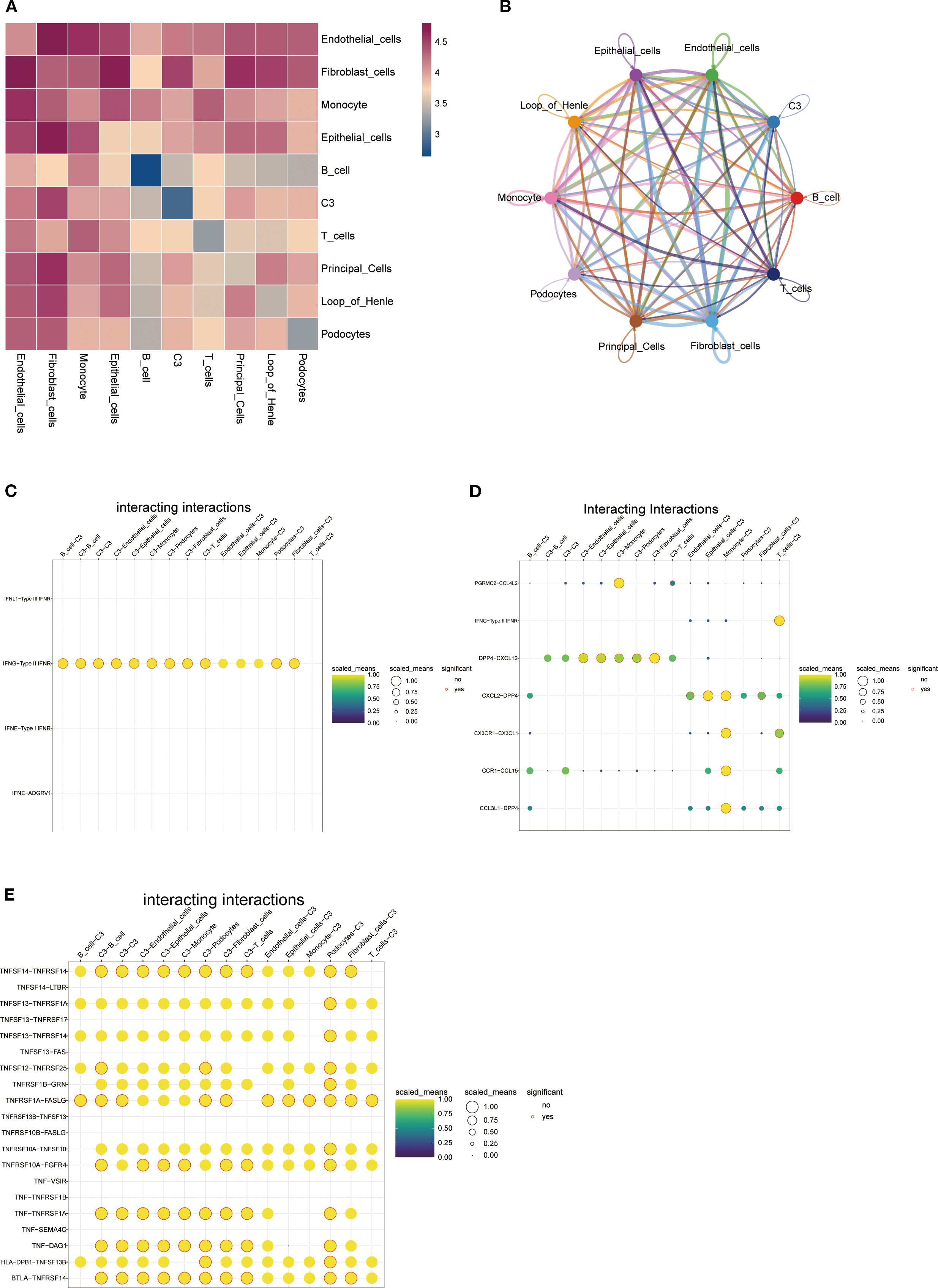 Figure 8. Cell-cell interaction networks: (A) Heatmap of intercellular interactions where deep red indicates stronger associations and blue denotes weaker correlations; (B) Network diagram displaying interaction relationships between cell clusters (colored nodes represent distinct cell types, connecting lines indicate significant interactions-greater line complexity reflects richer intercellular crosstalk); (C-E) Bubble plots demonstrating C3 cell cluster interactions via (C) interferon family factors, (D) CC-chemokine subfamily factors, and (E) tumor necrosis factor superfamily members (yellow-shaded bubbles indicate higher normalized values, red-circled solid dots denote statistical significance).