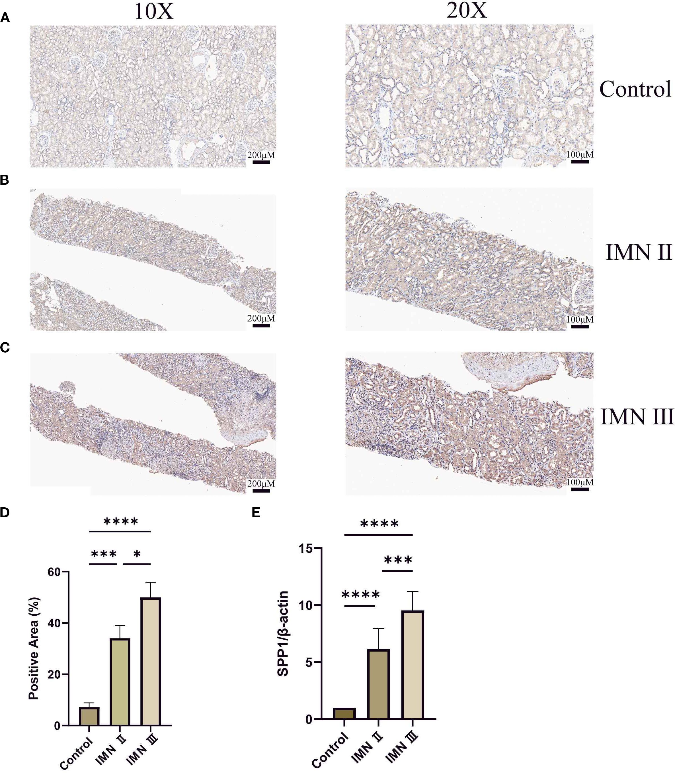 Figure 9. Detection of SPP1 expression in renal tissues by immunohistochemistry and qRT-PCR: (A-C) Immunohistochemical staining of SPP1 in control, stage II IMN, and stage III IMN renal tissues, respectively. Darker coloration indicates higher SPP1 expression levels. (D) Quantitative immunohistochemical analysis of the control, stage II IMN, and stage III IMN renal tissues. (E) qRT-PCR analysis of SPP1 expression in adjacent normal renal tissues, stage II IMN, and stage III IMN renal tissues. (*P < 0.05, **P < 0.01, ***P < 0.001, ****P < 0.0001).