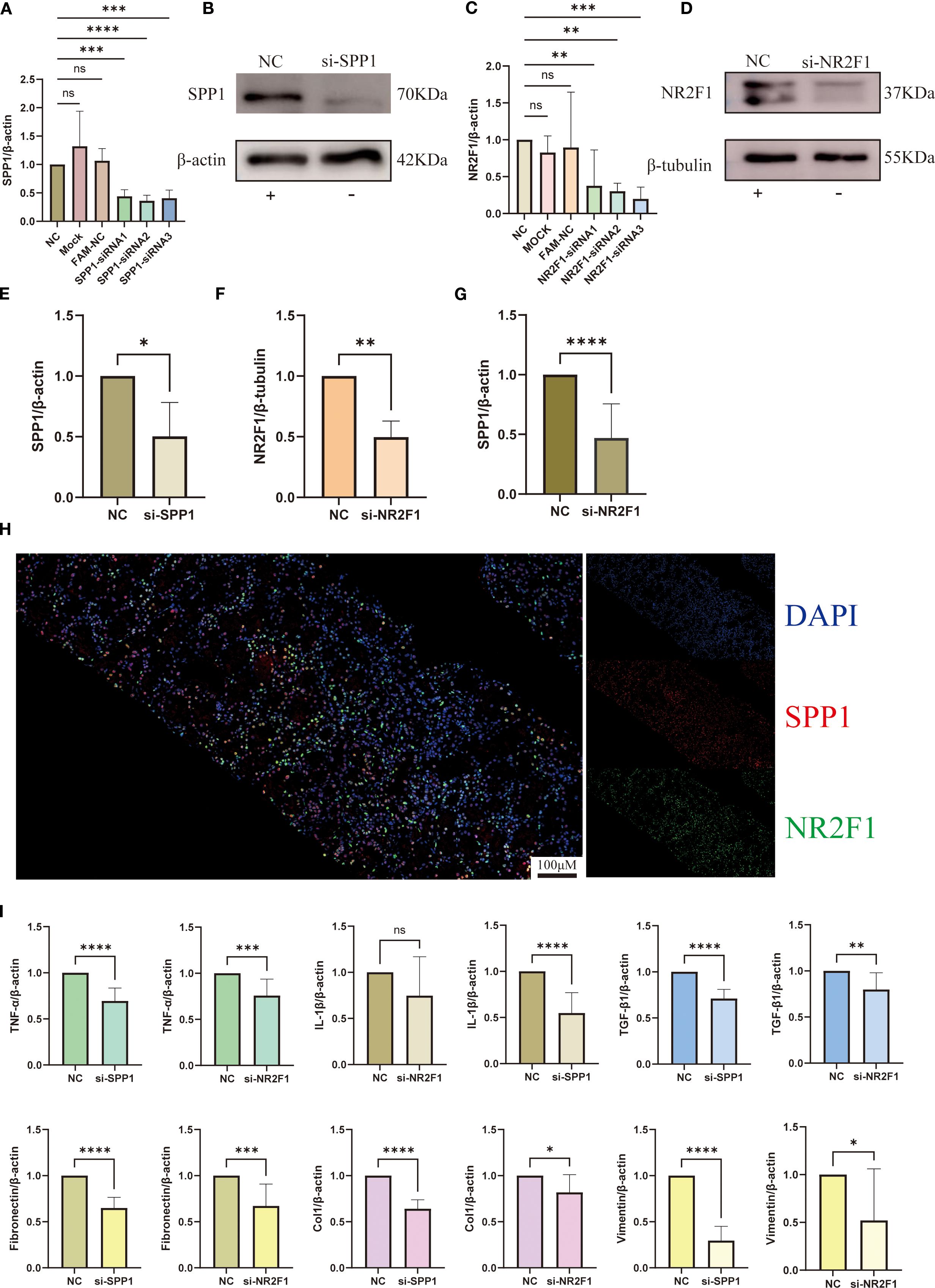 Figure 10. Interaction between SPP1 and NR2F1 and their regulatory mechanisms in inflammation and fibrosis: (A-F) Silencing efficiency of SPP1 and NR2F1 was validated by qRT-PCR and WB; (G) Altered SPP1 expression levels in si-NR2F1 group; (H) Dual-color immunofluorescence revealing intracellular spatial co-localization of SPP1 and NR2F1; (I) Expression profiles of inflammatory and fibrotic markers in si-SPP1 and si-NR2F1 group. (*P < 0.05, **P < 0.01, ***P < 0.001, ****P < 0.0001).