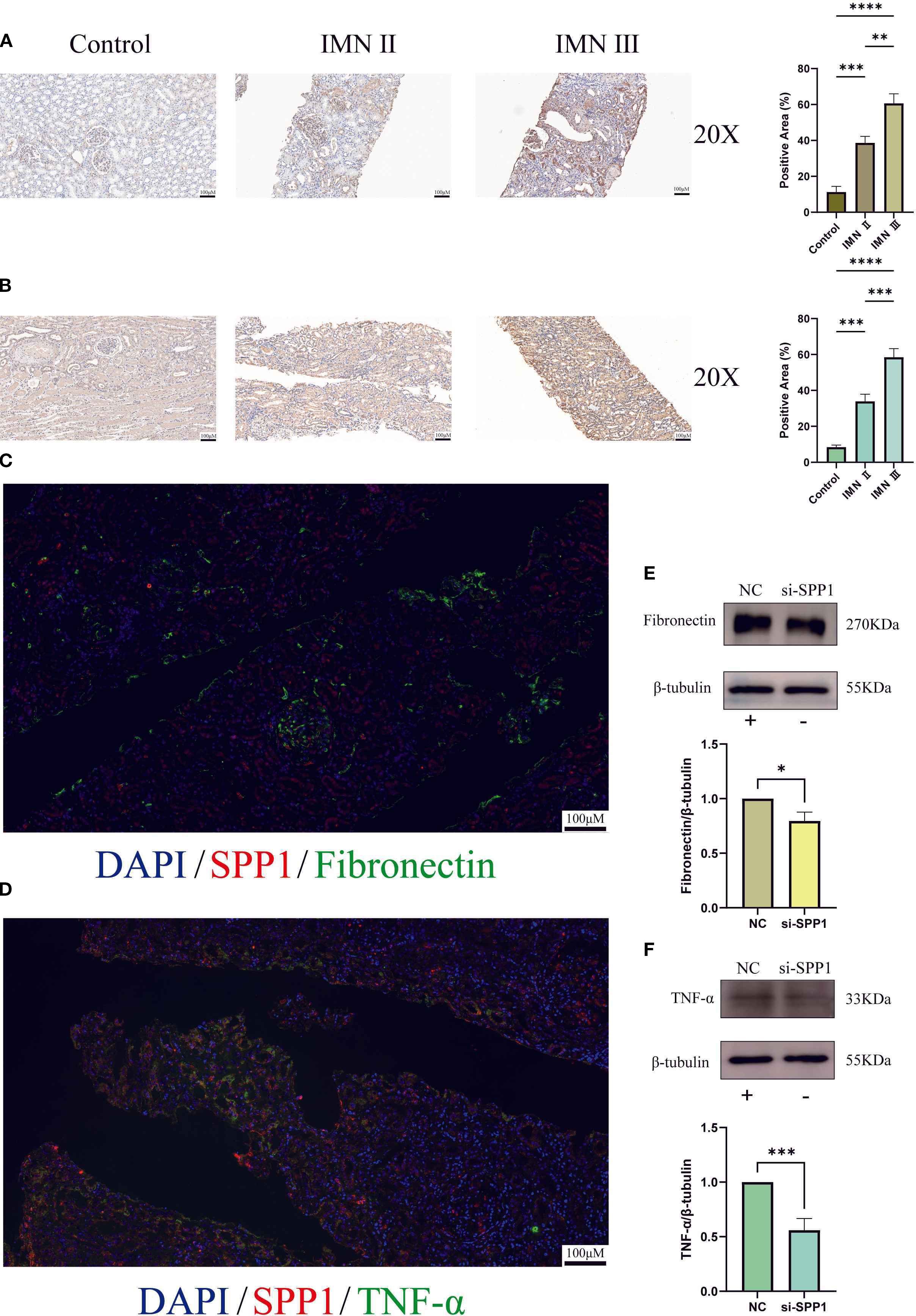 Figure 11. Immunohistochemistry, multicolor immunofluorescence, and construction of an SPP1-silenced cell line were performed to investigate the relationships between SPP1 and both Fibronectin as well as TNF-α: (A) Immunohistochemical expression profiles of Fibronectin in control, stage II IMN, and stage III IMN renal tissues; (B) Immunohistochemical expression patterns of TNF-α in control, stage II IMN, and stage III IMN renal tissues; (C) Dual-color immunofluorescence co-localization analysis of SPP1 and Fibronectin, revealing their spatial distribution correlation; (D) Dual-color immunofluorescence co-localization analysis of SPP1 and TNF-α, demonstrating their spatial association; (E) Effect of SPP1 silencing on Fibronectin expression levels; (F) Effect of SPP1 silencing on TNF-α expression levels. (*P < 0.05, **P < 0.01, ***P < 0.001, ****P < 0.0001).