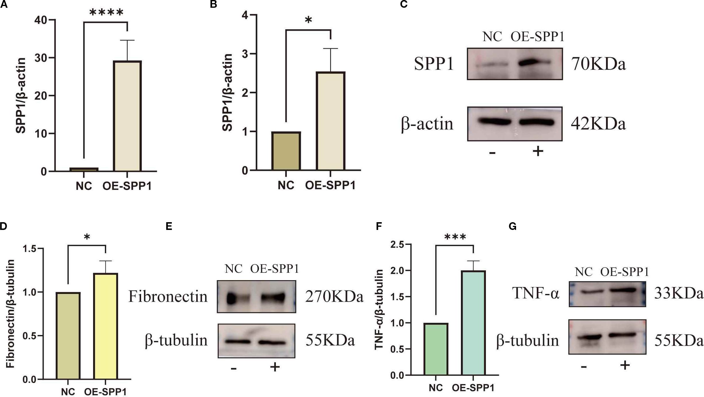 Figure 12. Overexpression of SPP1 to investigate the relationships between SPP1 and both Fibronectin as well as TNF-α: (A-C) Overexpression efficiency of SPP1 was validated by qRT-PCR and WB; (D-E) WB assay showing the expression levels of TNF-α in the OE-SPP1 group; (F, G) WB assay showing the expression levels of FN in the OE-SPP1 group. (*P < 0.05, **P < 0.01, ***P < 0.001, ****P < 0.0001).
