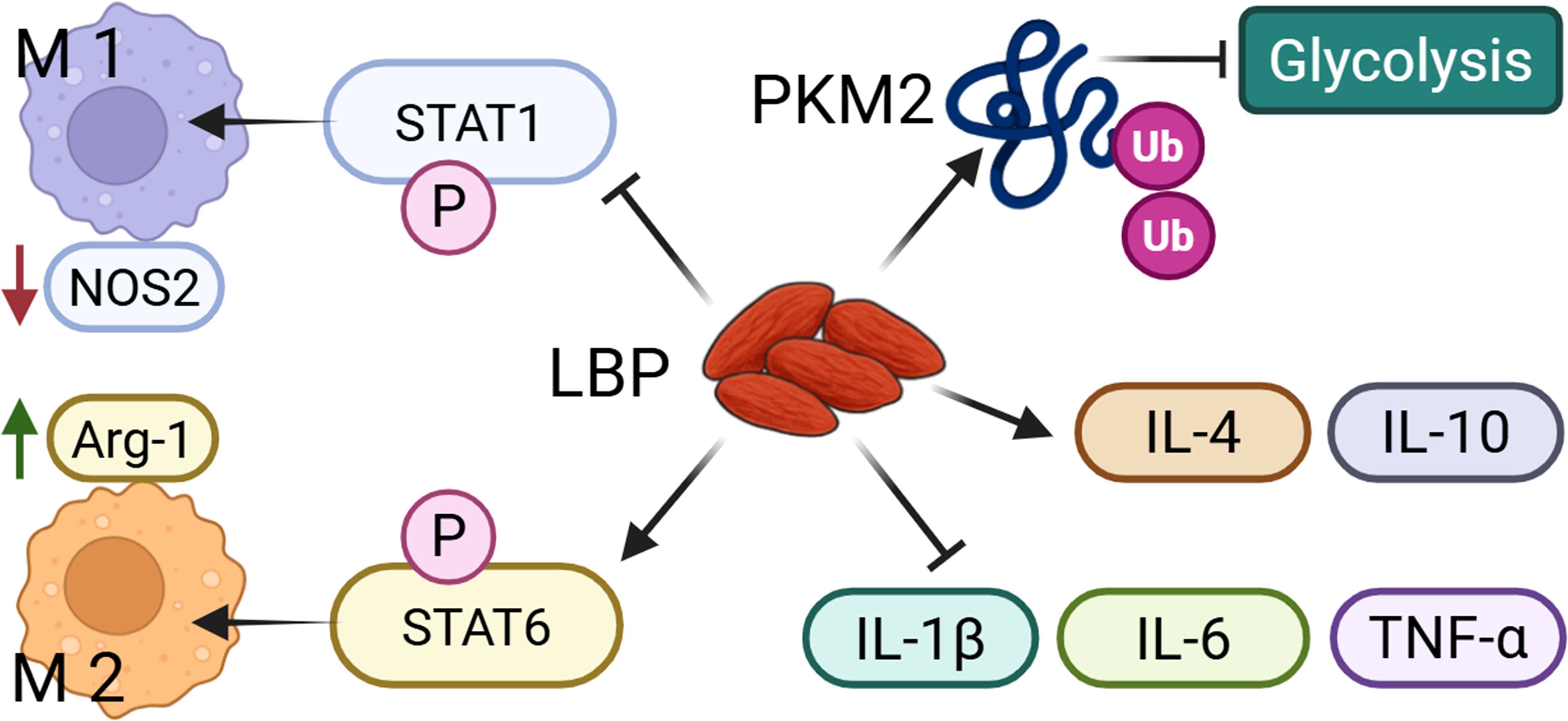 Figure 1. LBP could regulate the M1 and M2 polarization of macrophages. LBP promotes the polarization of macrophages toward the M1 and M2 phenotypes by inhibiting STAT1 phosphorylation and activating STAT6 phosphorylation, respectively. In addition, LBP suppresses glycolysis via PKM2 ubiquitination, and increases the production of anti-inflammatory cytokines while reduces pro-inflammatory mediators.