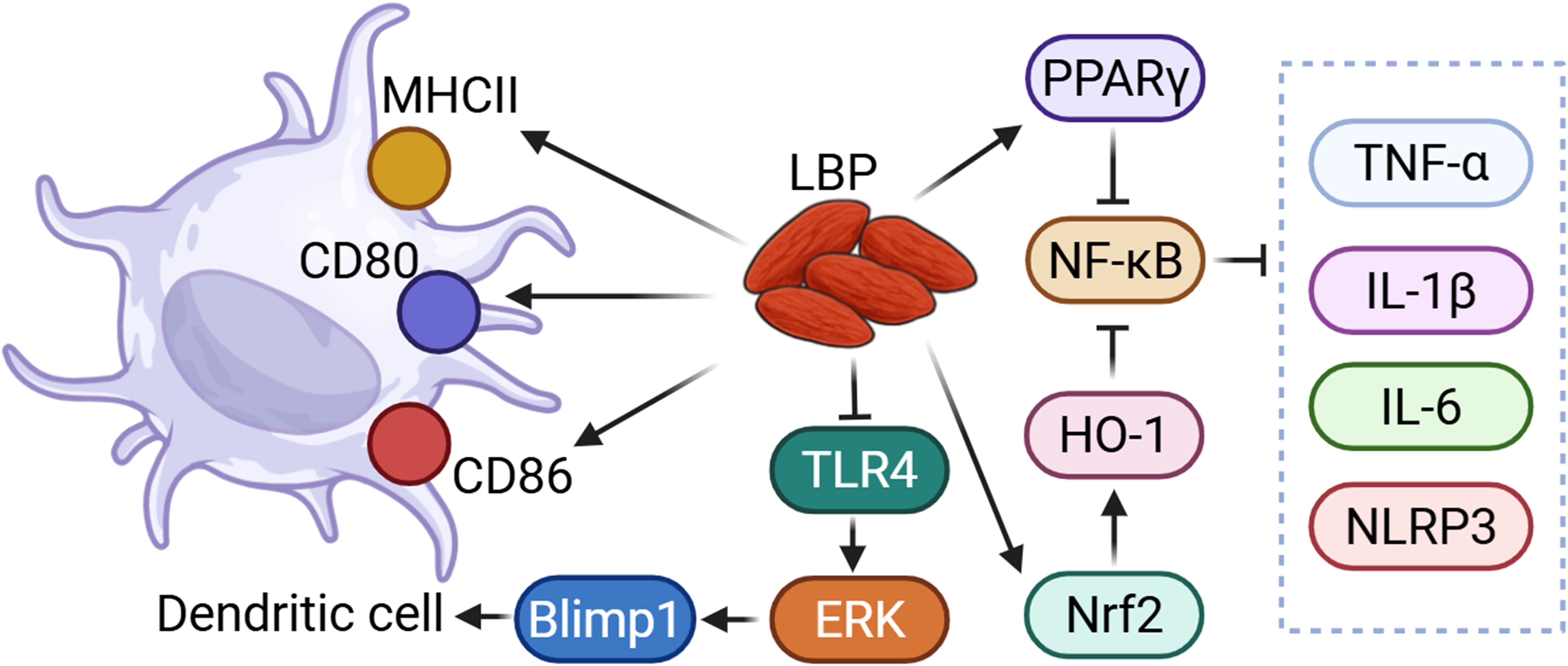 Figure 2. LBP could regulate immune function through TLR and NF-κB related pathway. LBP could modulate dendritic cells via the TLR4/ERK/Blimp1 signaling pathway. Additionally, LBP could suppress NF-κB activity through the activation of PPARγ and the Nrf2/HO-1 pathway, thereby reducing the levels of pro-inflammatory cytokines and inflammasomes.