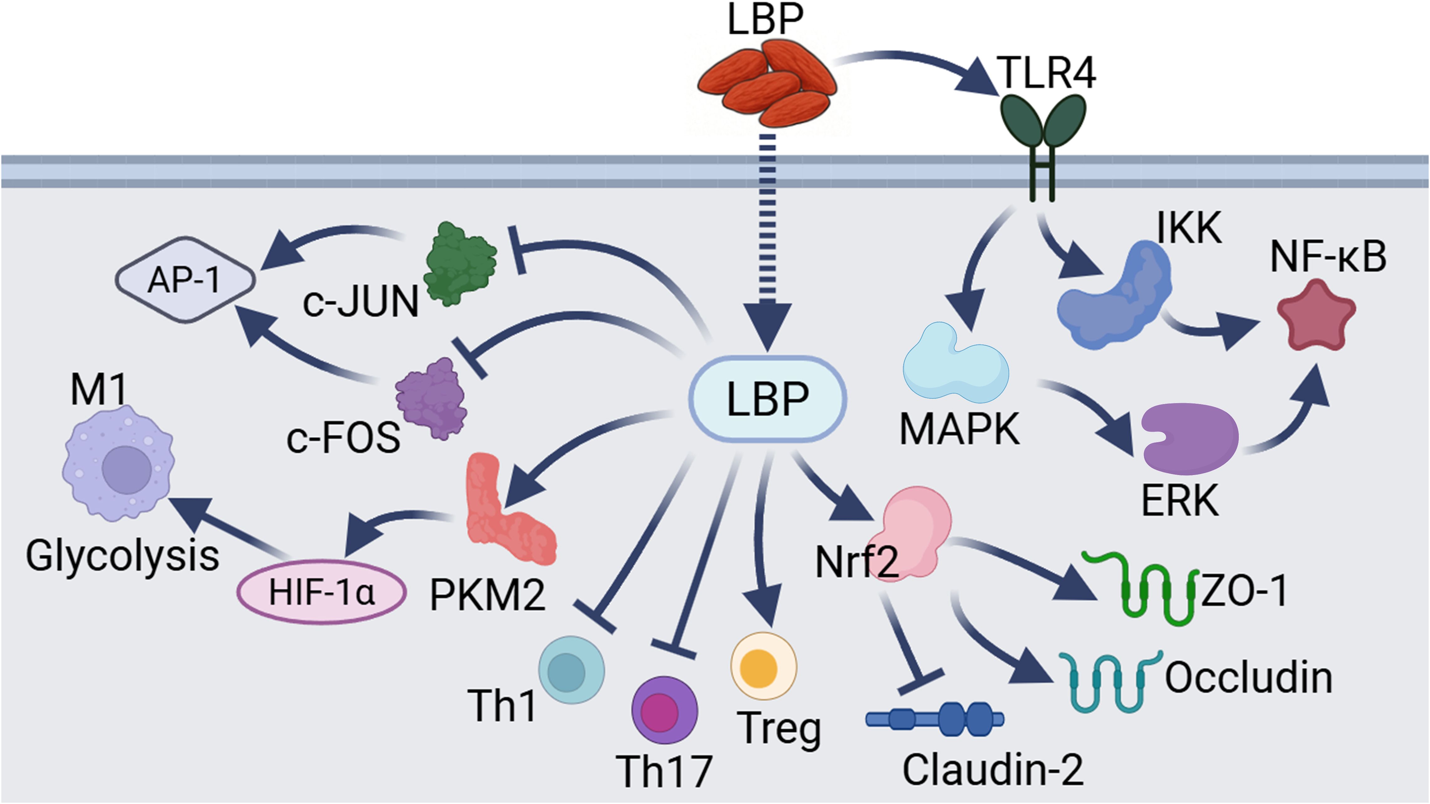 Figure 3. Other mechanisms underlying LBP-mediated immunomodulation. These pathways include the regulation of key targets such as AP-1, glycolysis, Th1, Th17, Treg, junctional proteins, and NF-κB by LBP through distinct mechanisms.