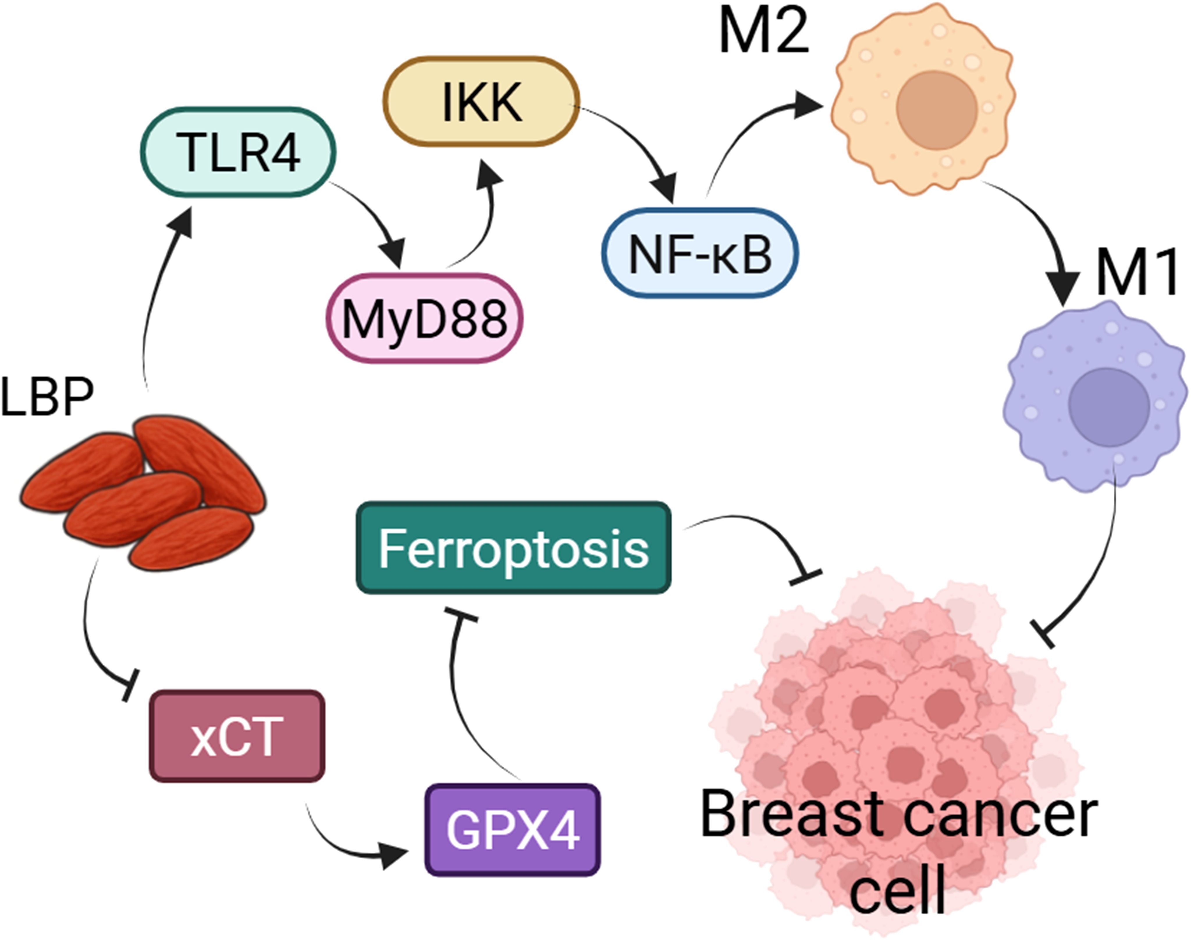 Figure 4. LBP could inhibit the growth of breast cancer cells by regulating macrophage polarization and ferroptosis. LBP could participate in the polarization of macrophages from the M2 to the M1 phenotype via the TLR4/MyD88/IKK/NF-κB signaling pathway, thereby suppressing the proliferation of breast cancer cells. Similarly, LBP inhibits the proliferation of breast cancer cells by modulating ferroptosis through the xCT/GPX4 axis.