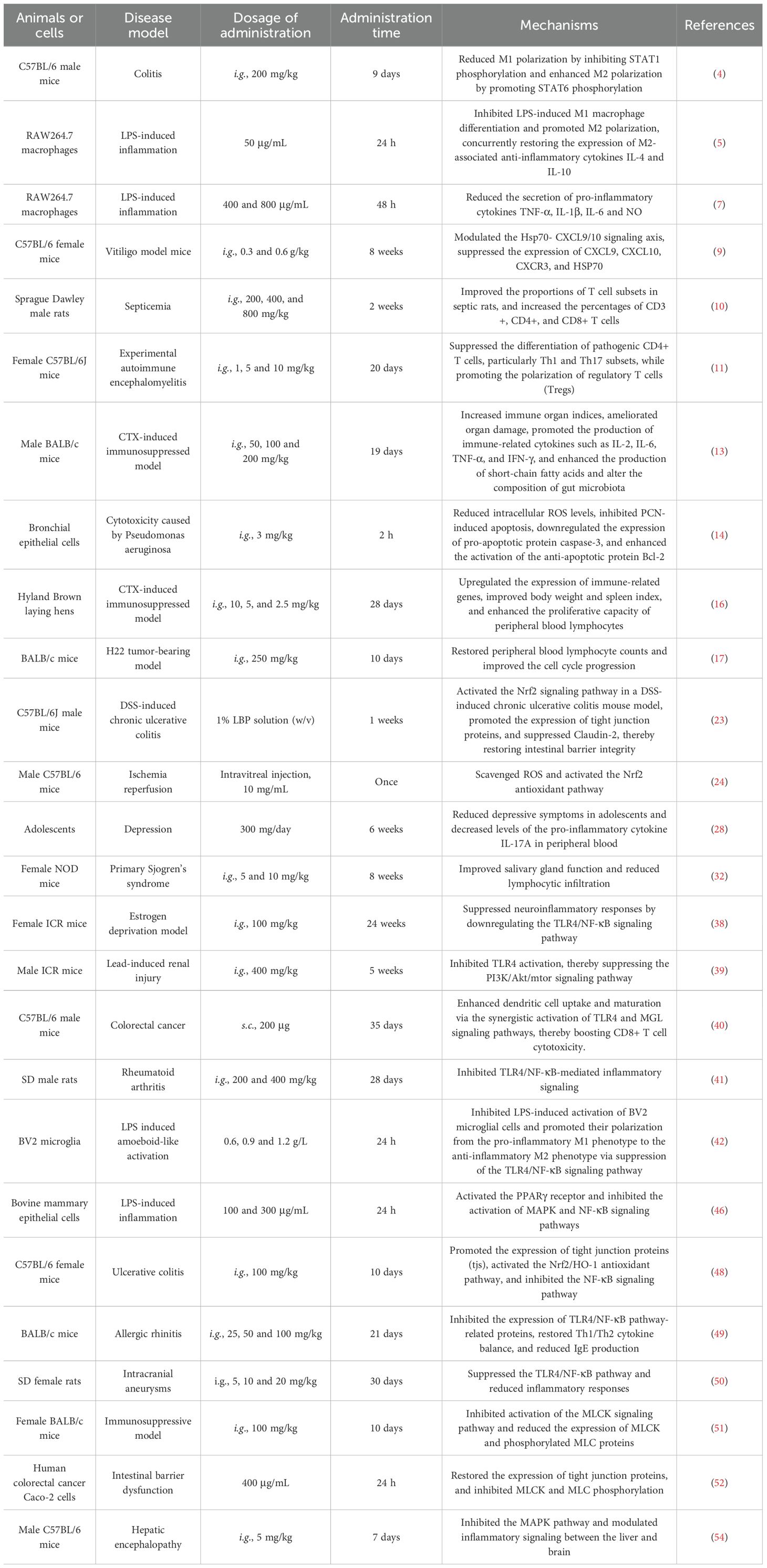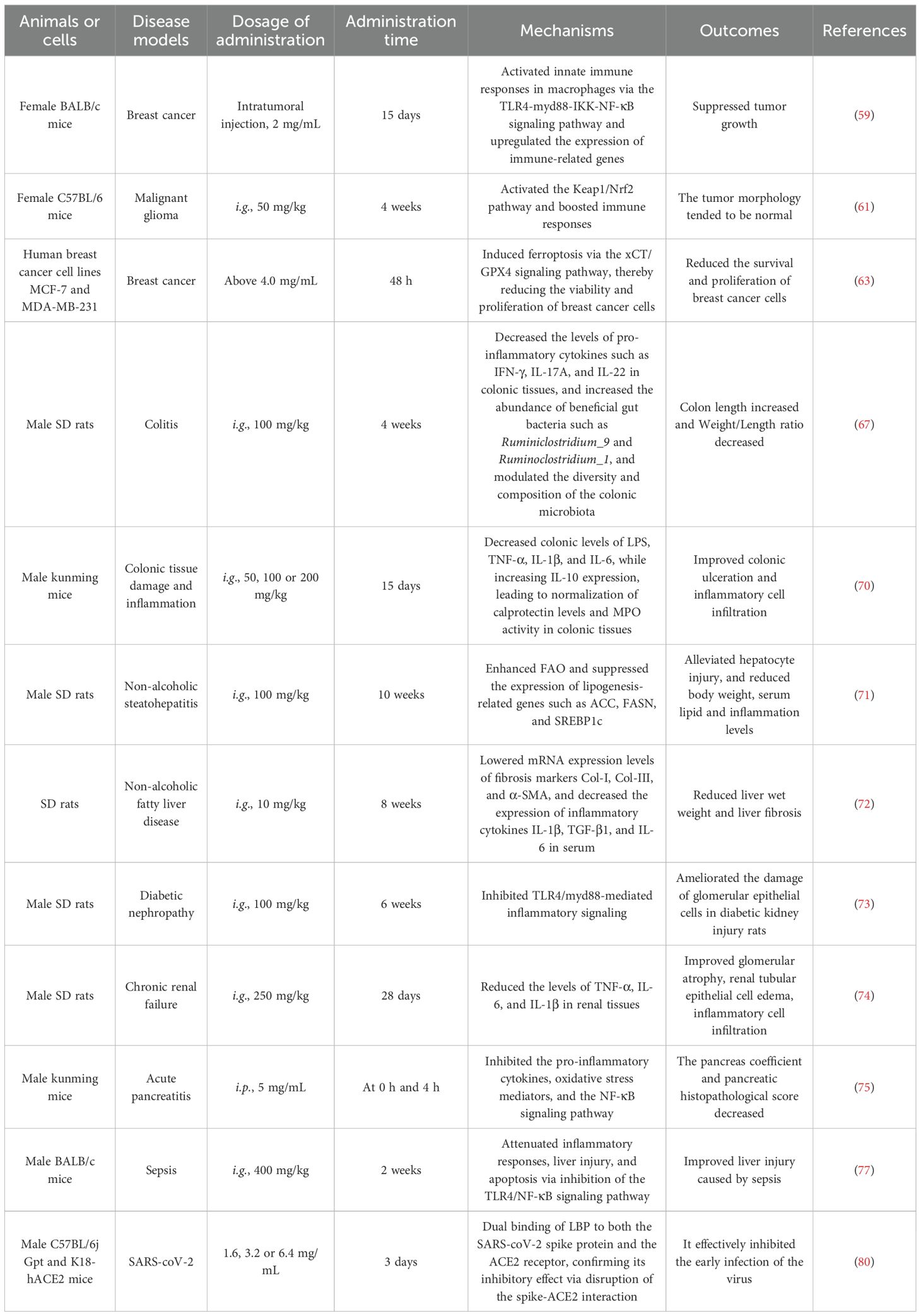The study has shown that the diabetic nephropathy could induced renal dysfunction, glomerular structural damage, and inflammatory infiltration in rats. Administration of LBP (i.g., 100 mg/kg) alleviated renal injury, suppressed inflammation, improved kidney function, and downregulated the expression of TLR4, MyD88, and NF-κB proteins in diabetic nephropathy rats. The protective effect of LBP against diabetic renal injury is probably associated with the inhibition of TLR4/MyD88-mediated inflammatory signaling (73). LBP also exhibits protective effects in rats with chronic renal failure (CRF). Following LBP (i.g., 250 mg/kg) intervention, the levels of TNF-α, IL-6, and IL-1β in renal tissues were reduced, and kidney morphology was markedly restored compared to the CRF model rats. These results suggest that LBP improves renal pathology in CRF rats, possibly by suppressing inflammatory responses (74). LBP is effective in ameliorating inflammation and oxidative stress in mice with acute pancreatitis (AP). Treatment with LBP (i.p., 5 mg/mL) resulted in a reduced pancreatic index, lower histopathological scores, decreased serum levels of IL-6, IL-1β, and TNF-α, reduced MDA and MPO levels in pancreatic tissue, increased SOD levels, and downregulation of p65 mRNA and protein expression in AP model mice. These findings indicate that LBP protects against pancreatic injury in AP model mice, likely through inhibition of pro-inflammatory cytokines, oxidative stress mediators, and the NF-κB signaling pathway (75).