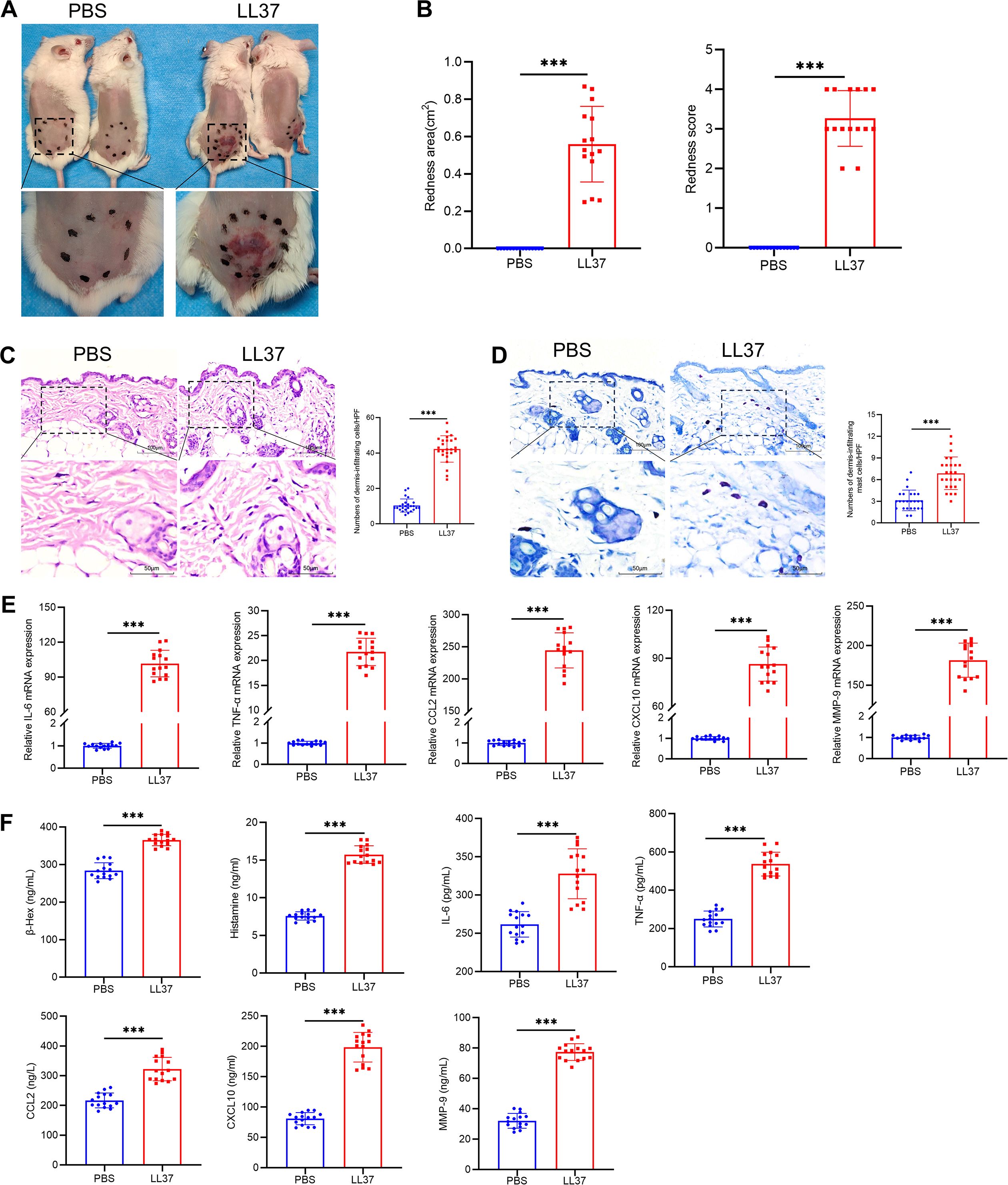 Figure 1. Establishment of LL37-induced rosacea-like dermatitis mouse model. (A) Representative images of rosacea-like lesions in each group 12h after the final LL37 injection. (B) Severity of rosacea-like lesions evaluated based on redness area and redness score. Representative H&E (C) and toluidine blue (D) staining of skin/lesion tissue sections. Quantitative analysis of dermal infiltrating cells and mast cells per high-power field. (E) mRNA levels of IL-6, TNF-α, CCL2, CXCL10 and MMP-9 in skin/lesion tissues. (F) Secretion levels of β-Hex, histamine, IL-6, TNF-α, CCL2, CXCL10 and MMP-9 in skin/lesion tissues. n=5 per group; data are presented as mean ± SD of at least three independent experiments, ***P < 0.001. Scale bar: 50 μm.
