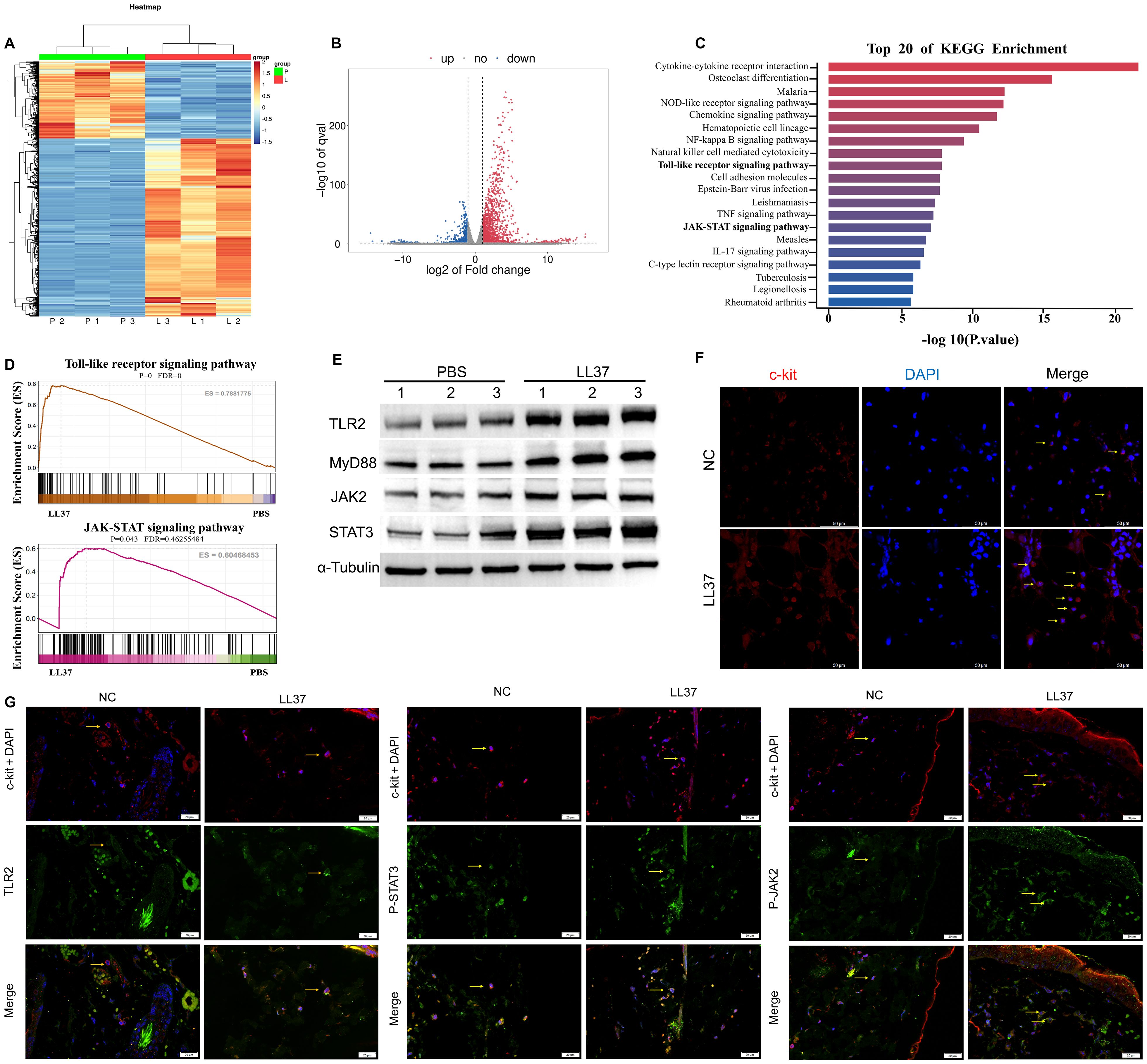 Figure 2. Activation of the TLR2/JAK2 pathway in mast cells of LL37-induced rosacea-like mice. (A) Heatmap of differentially regulated transcripts in skin/lesion tissues between control (P: normal skin) and model (L: lesional skin) groups. Blue indicates low FPKM expression; red indicates high FPKM expression. Volcano plot of differentially expressed genes (B) and KEGG pathway enrichment analysis (C) in skin/lesion tissues. (D) GSEA analysis showing enrichment of Toll-like receptor and JAK-STAT signaling pathways. (E) Expression levels of TLR2, MyD88, JAK2 and STAT3 in skin/lesion tissues. The blots shown are representative of three independent experiments. (F) Immunofluorescence staining of c-kit (red) and DAPI (blue) in skin/lesion tissues. (G) Co-localization of c-kit (red) with TLR2, p-JAK2 and p-STAT3 (green) in skin/lesion tissues. Scale bar: 50 μm.