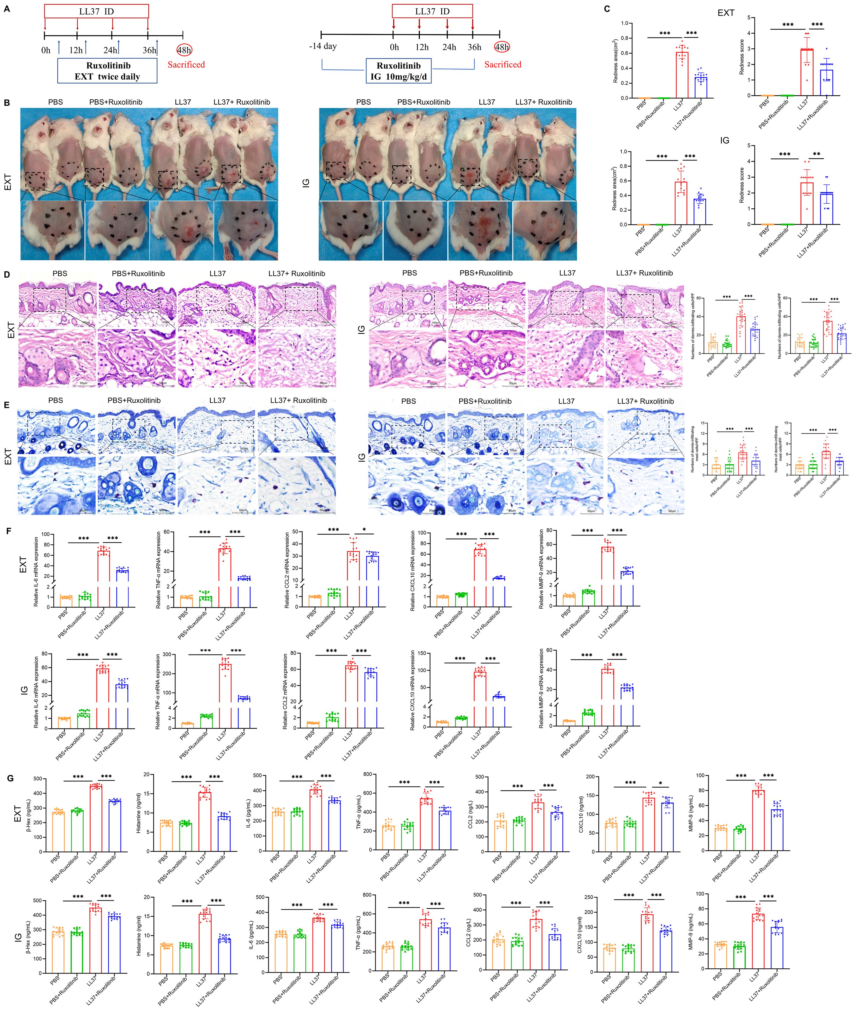 Figure 3. JAK2 inhibitor alleviates rosacea-like lesions in mice. (A) Schematic of LL37-induced model and ruxolitinib treatment. EXT: External Application, IG: Intragastric Administration. (B) Representative images of lesions post- ruxolitinib treatment. (C) Lesion severity assessed by redness area and score. H&E (D) and toluidine blue (E) staining of skin/lesion tissues. (F) mRNA levels of IL-6, TNF-α, CCL2, CXCL10 and MMP-9. (G) Secretion levels of β-Hex, histamine, and cytokines. n=5 per group; data are presented as mean ± SD of at least three independent experiments, *P < 0.05, **P < 0.01, ***P < 0.001. Scale bar: 50 μm.