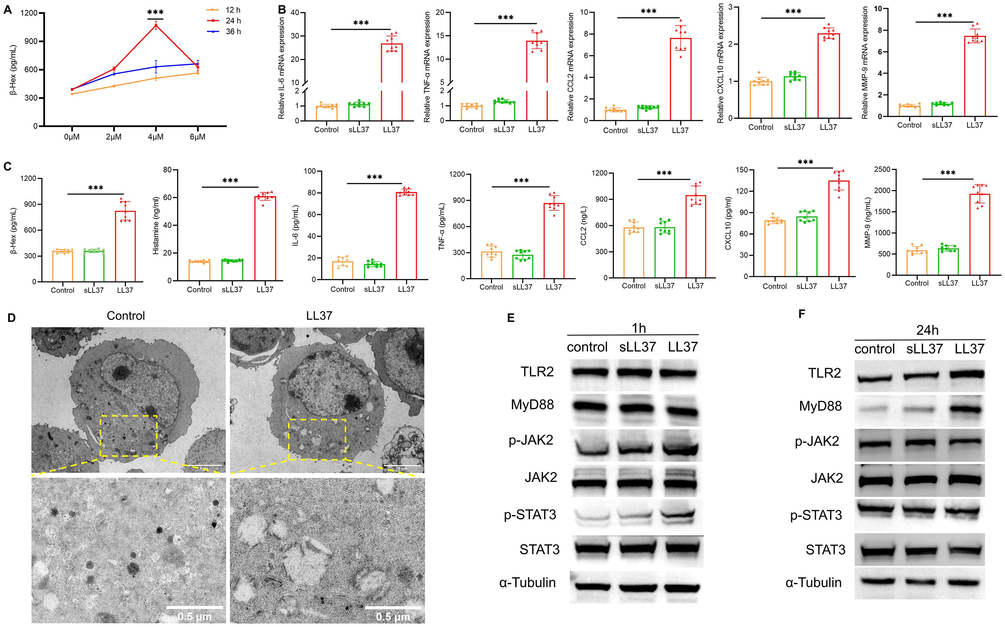 Figure 4. LL37 induces mast cell activation and degranulation. (A) β-Hex secretion in LUVA cells treated with LL37 at varying concentrations/durations. (B) mRNA levels of IL-6, TNF-α, CCL2, CXCL10 and MMP-9 in cells of each group. (C) Secretion levels of β-Hex, histamine, IL-6, TNF-α, CCL2, CXCL10 and MMP-9 in cells of each group. (D) Transmission electron microscopy images of degranulation in LL37-treated mast cells. (E) Expression of TLR2, MyD88, p-JAK2 and p-STAT3 in cells of each group after 1h incubation with LL37. (F) Expression of TLR2, MyD88, p-JAK2 and p-STAT3 in cells from each group after 24h incubation with LL37. n = 3 per group; data are presented as mean ± SD of at least three independent experiments, ***P < 0.001.