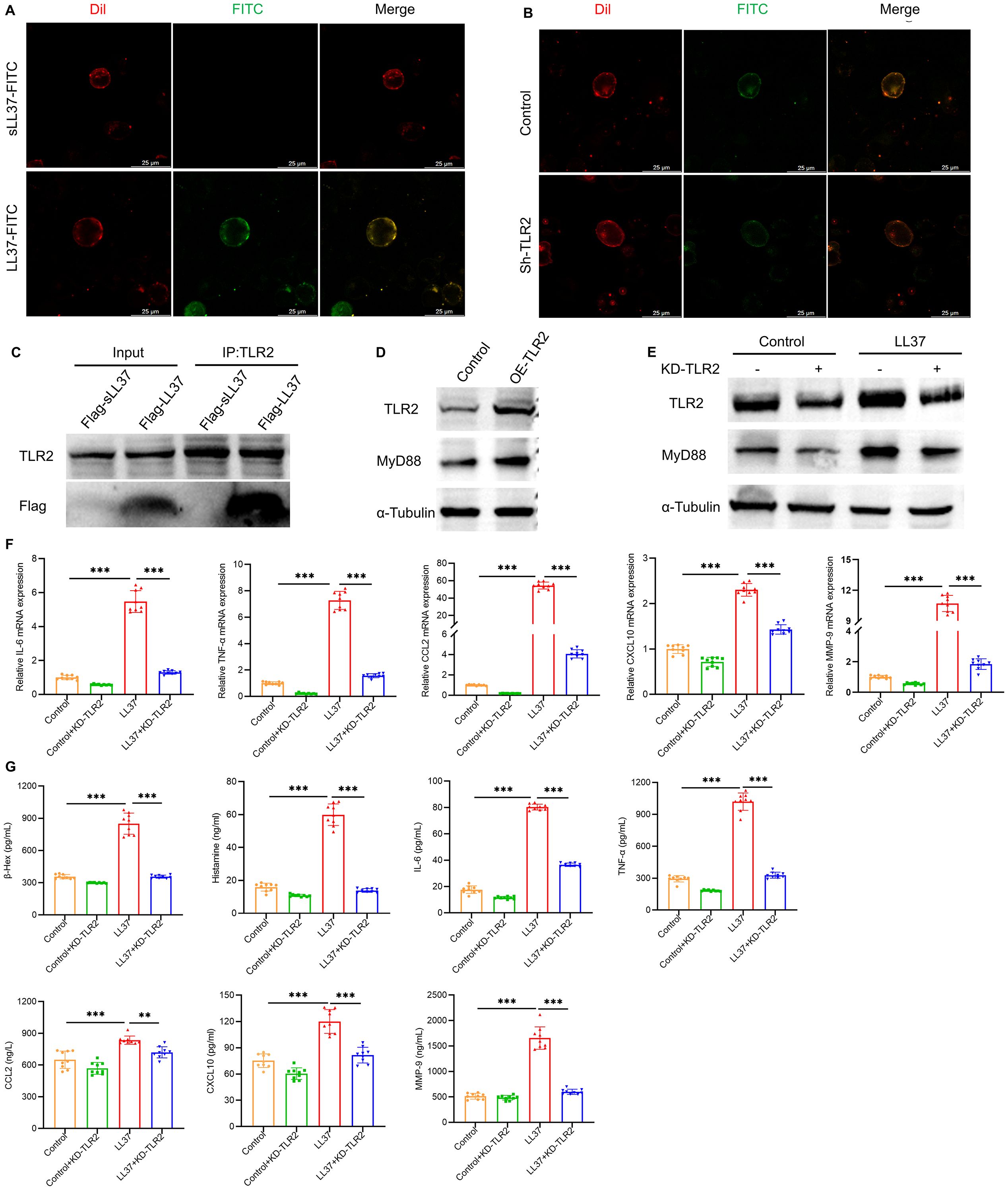 Figure 5. LL37 binds to TLR2 on mast cells to induce activation and degranulation. (A) Membrane localization of LL37/sLL37 in LUVA cells. Scale bar: 25 μm. (B) Membrane localization of LL37 in TLR2-knockdown mast cells. (C) Co-immunoprecipitation of LL37-flag with TLR2. (D) Expression levels of TLR2 and MyD88 in TLR2-overexpressing. (E) Expression levels of TLR2 and MyD88 in cells of each group. (F) mRNA levels of IL-6, TNF-α, CCL2, CXCL10 and MMP-9 in cells of each group. (G) Secretion levels of β-Hex, histamine, IL-6, TNF-α, CCL2, CXCL10 and MMP-9 in cells of each group. n = 3 per group; data are presented as mean ± SD of at least three independent experiments, **P < 0.01, ***P < 0.001.