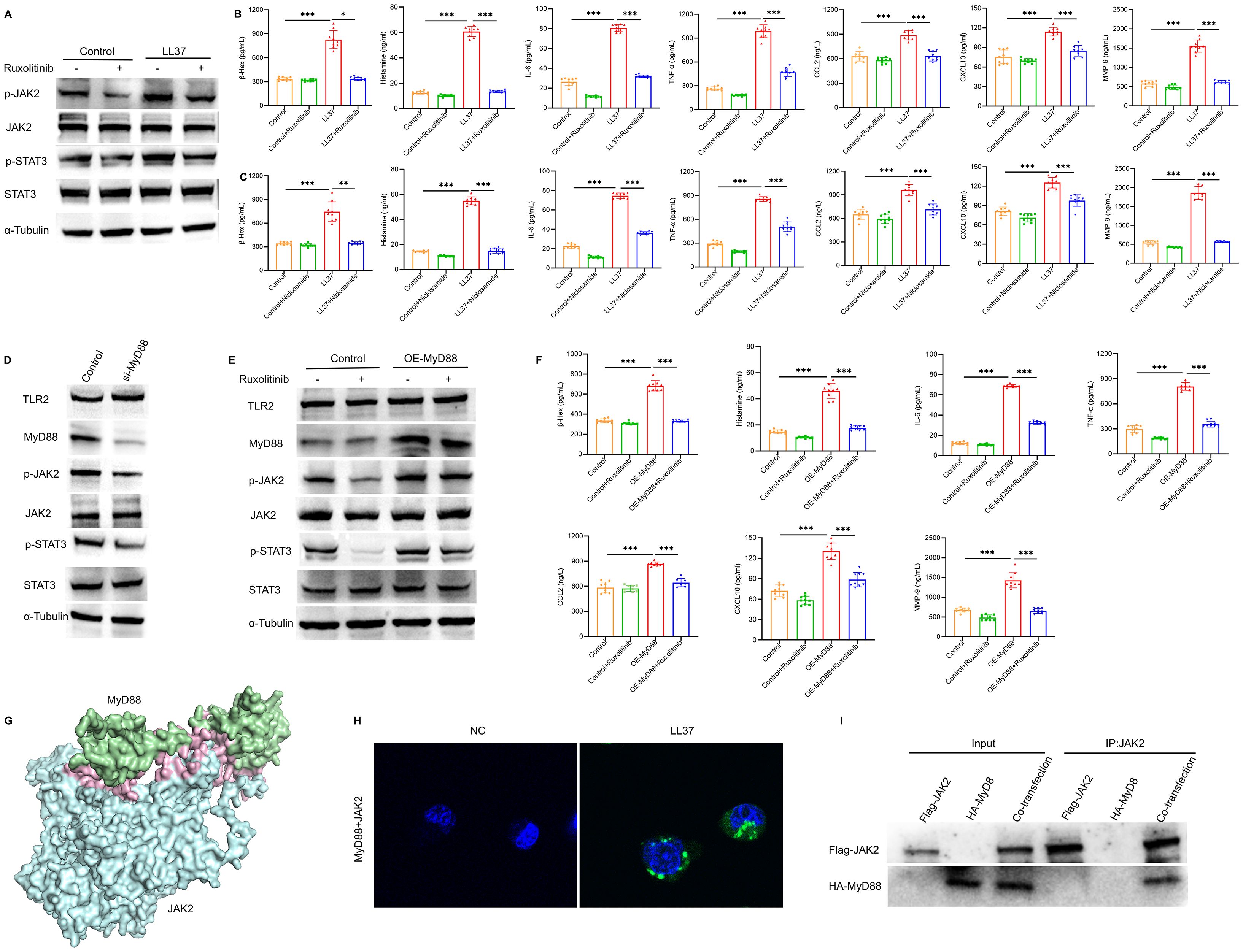 Figure 6. TLR2/MyD88 signaling regulates JAK2/STAT3 activation in mast cells. (A) Expression levels of p-JAK2 and p-STAT3 in LUVA cells of each group. (B, C) Secretion levels of β-Hex, histamine, IL-6, TNF-α, CCL2, CXCL10 and MMP-9 in cells of each group. (D) Expression of TLR2, MyD88, p-JAK2 and p-STAT3 in MyD88-knockdown cells. (E) Expression levels of TLR2, MyD88, p-JAK2 and p-STAT3 in cells of each group. (F) Secretion levels of β-Hex, histamine, IL-6, TNF-α, CCL2, CXCL10 and MMP-9 in cells of each group. (G) Three-dimensional model of MyD88-JAK2 molecular docking. (H) PLA showing MyD88-JAK2 the physical interaction (green dots). (I) Co-IP demonstrates the interaction between MyD88 and JAK2. n = 3 per group, data are presented as mean ± SD of at least three independent experiments, *P < 0.05, **P < 0.01, ***P < 0.001.