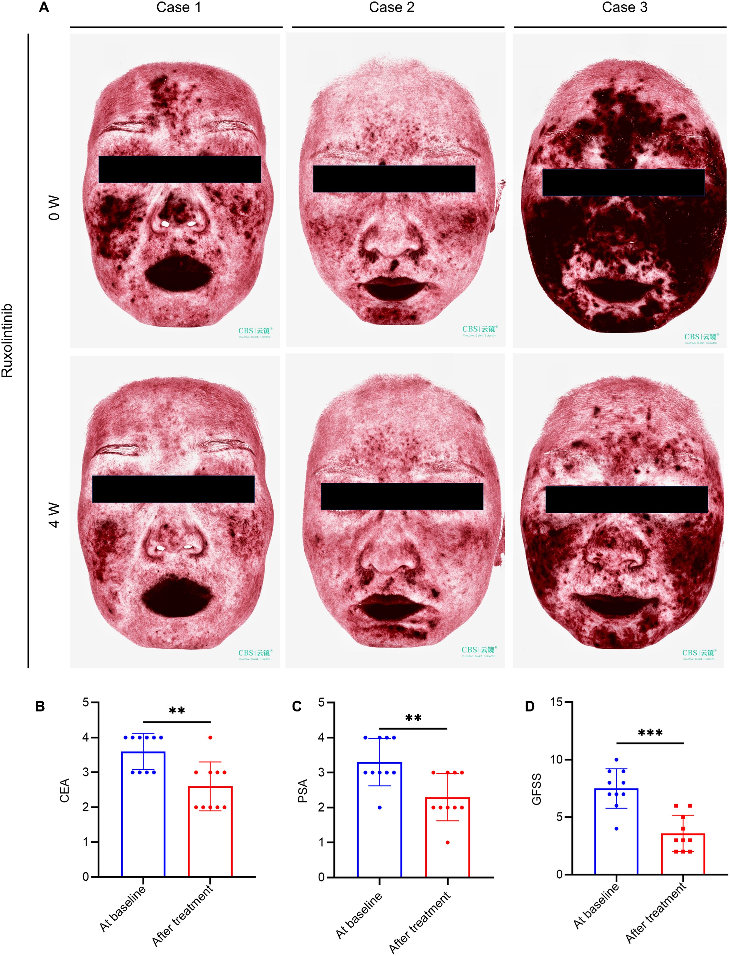 Figure 7. Topical ruxolitinib improves rosacea lesions in patients. (A) VISIA imaging of facial lesions in 3 erythematotelangiectatic rosacea (ETR) patients pre- and post-treatment. Changes in Clinician’s Erythema Assessment (CEA) (B), Patient Self-Assessment (PSA) (C) and Global Flushing Symptom Score (GFSS) (D). Data are presented as mean ± SD of at least three independent experiments, **P < 0.01, ***P < 0.001.