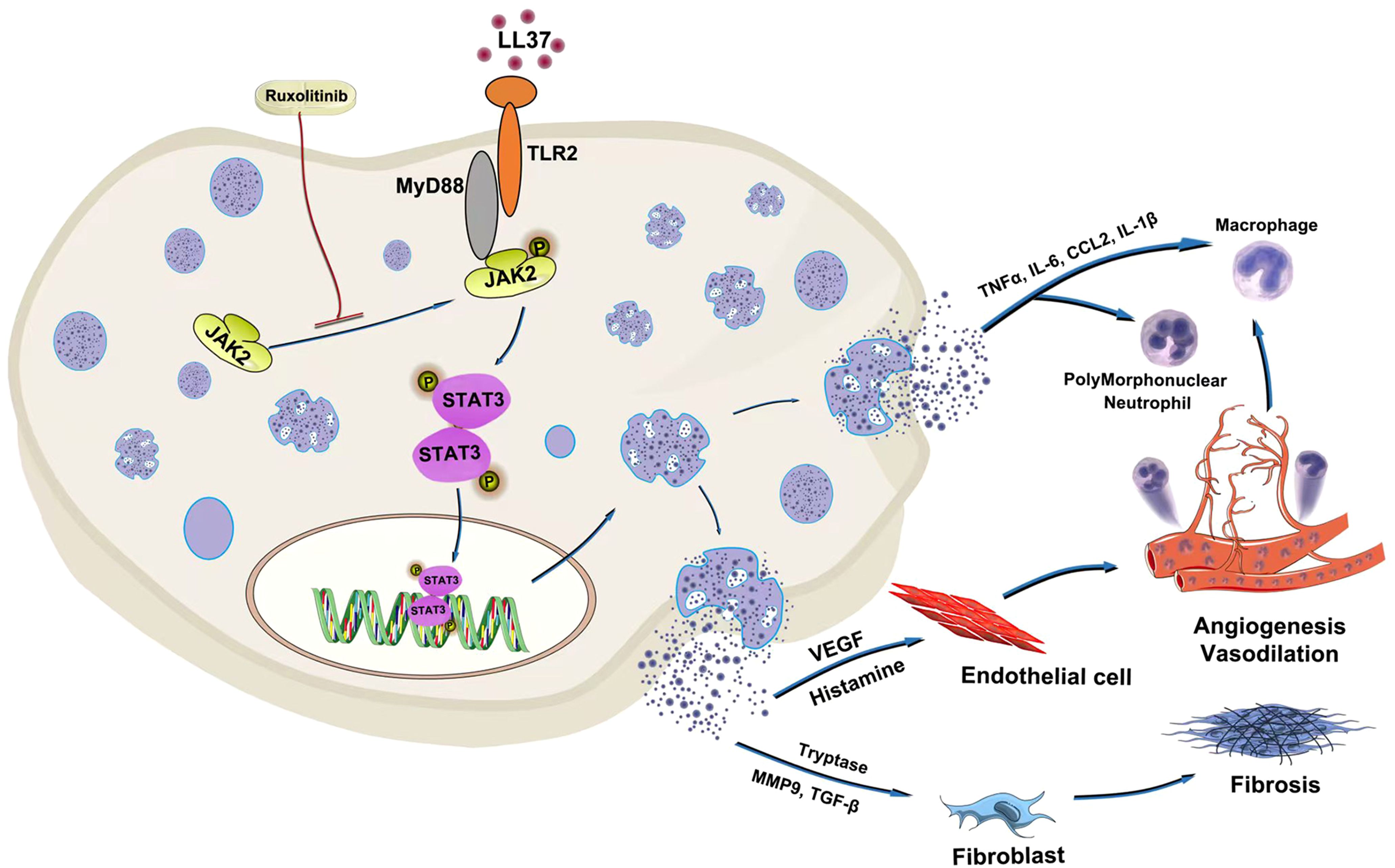 The molecular mechanisms driving mast cell activation in rosacea remain poorly understood, though recent studies highlight the involvement of two key signaling pathways: the TLR2/MyD88 pathway and the Janus kinase/signal transducer and activator of transcription (JAK/STAT) pathway. TLR2 is a well-known immune receptor of mast cells, and its downstream adaptor protein, MyD88, is significantly upregulated in rosacea lesions (16–18). Meanwhile, the JAK/STAT signaling axis is crucial for mast cell survival, activation, and degranulation, with JAK2 serving as a key regulator (19). However, whether LL37 activates mast cells via these pathways, and how this contributes to the inflammatory cascade of rosacea, remains an open question.