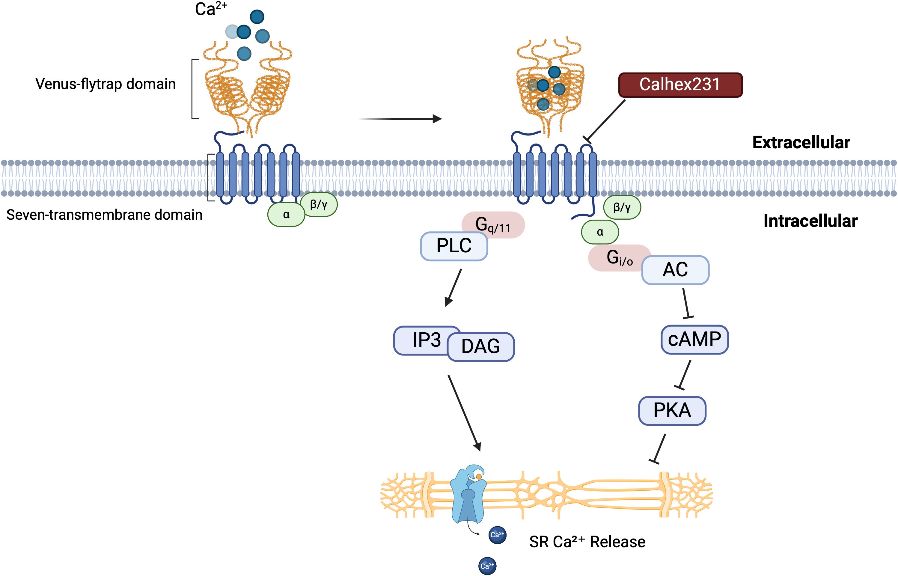 Figure 1. CaSR structure and activation mechanism. The interaction between the extracellular domain of the CaSR, known as the “Venus flytrap,” and calcium ions initiates receptor activation. This activation leads to conformational changes that trigger downstream signaling pathways. Calhex231, a well-characterized inhibitor of CaSR, can prevent this activation process. This figure provides a comprehensive overview of the CaSR activation mechanism and its role in regulating intracellular calcium levels through multiple signaling pathways. A thorough understanding of these mechanisms is essential for clarifying the physiological and pathophysiological roles of CaSR in various cellular processes.