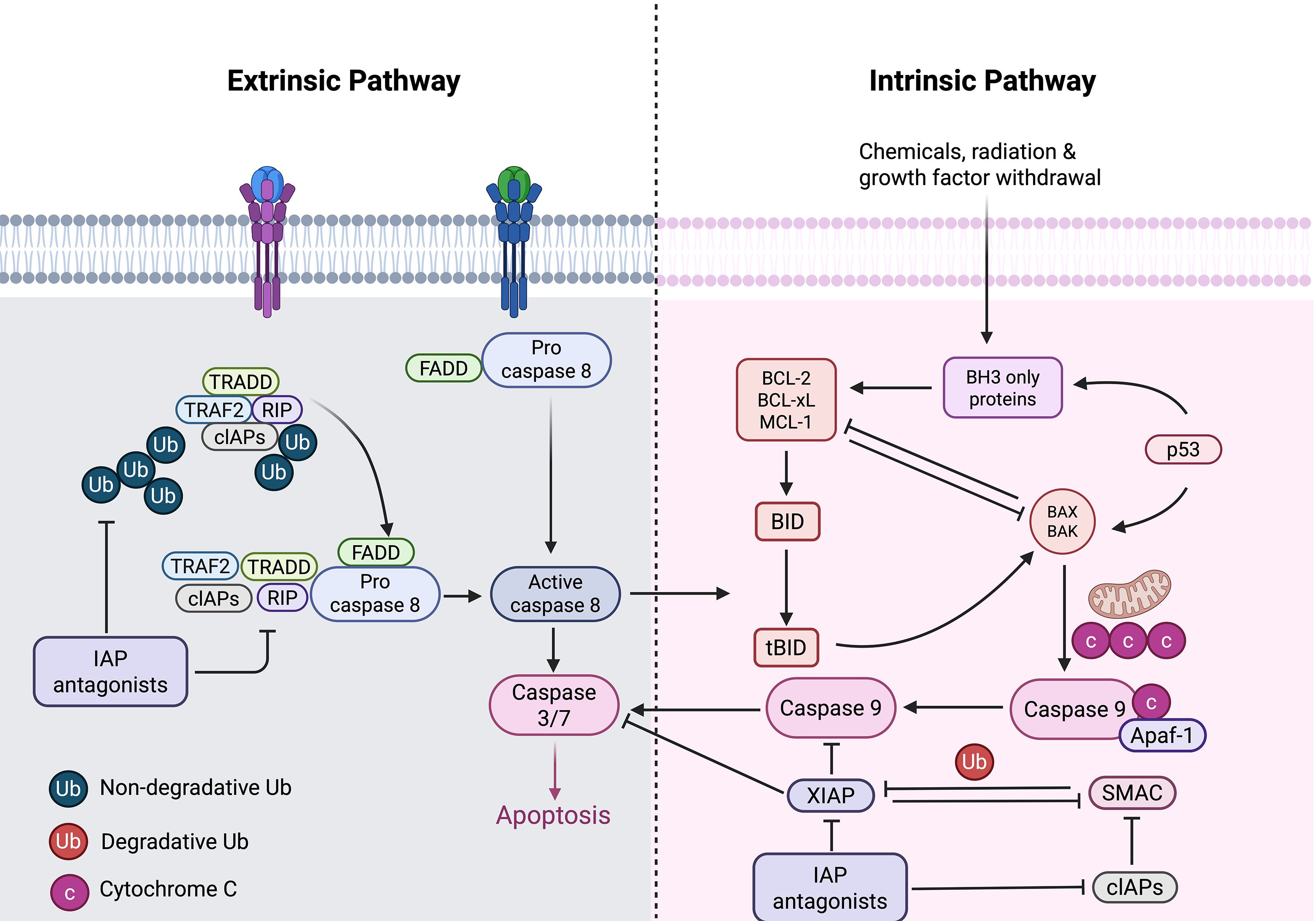 Figure 2. Intrinsic and extrinsic pathways of apoptosis. The intrinsic pathway is initiated by various intracellular stress signals, including chemicals, radiation, and growth factors withdrawal. These signals cause permeation of the outer mitochondrial membrane, resulting in the release of Cyt C from apoptotic precursor proteins into the cell. Subsequently, it forms a complex with Apaf-1 and procaspase-9. Activation of caspase-9, which in turn activates executioner caspases, leading to apoptosis. The intrinsic pathway is regulated by the balance between pro-apoptotic (BAX, BAK) and anti-apoptotic (BCL-2, BCL-xL, MCL-1) Bcl-2 family proteins. In the extrinsic pathway, the ligand binds to the cell surface receptor, initiating the activation of pro-caspase-8, which then cleaves and activates the executioner proteases (protease-3/7), thereby leading to cell apoptosis. Caspase-8 activation can be modulated by the presence of inhibitor of apoptosis proteins (IAPs), which can either be non-degradative (Ub) or degradative (Ub).