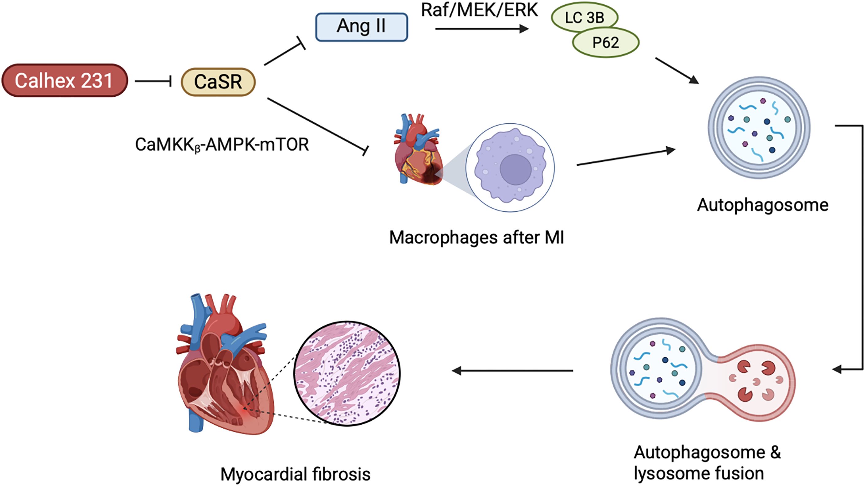 Figure 3. The role of CaSR-mediated autophagy in cardiac remodeling. The activation of CaSR promotes the autophagy process in cardiac fibroblasts, and autophagy further aggravates myocardial fibrosis. AngII can enhance the expression of CaSR and, by activating the Raf/MEK/ERK pathway, upregulates autophagy-related proteins (such as LC3B, P62). After MI, CaSR in macrophages further drives autophagy and activation of the inflammatory body through inhibiting the CaMKKβ-AMPK-mTOR pathway, thereby exacerbating ventricular remodeling. Calhex 231, as an antagonist of CaSR, can inhibit autophagy and alleviate inflammation, fibrosis, and hypertrophy.