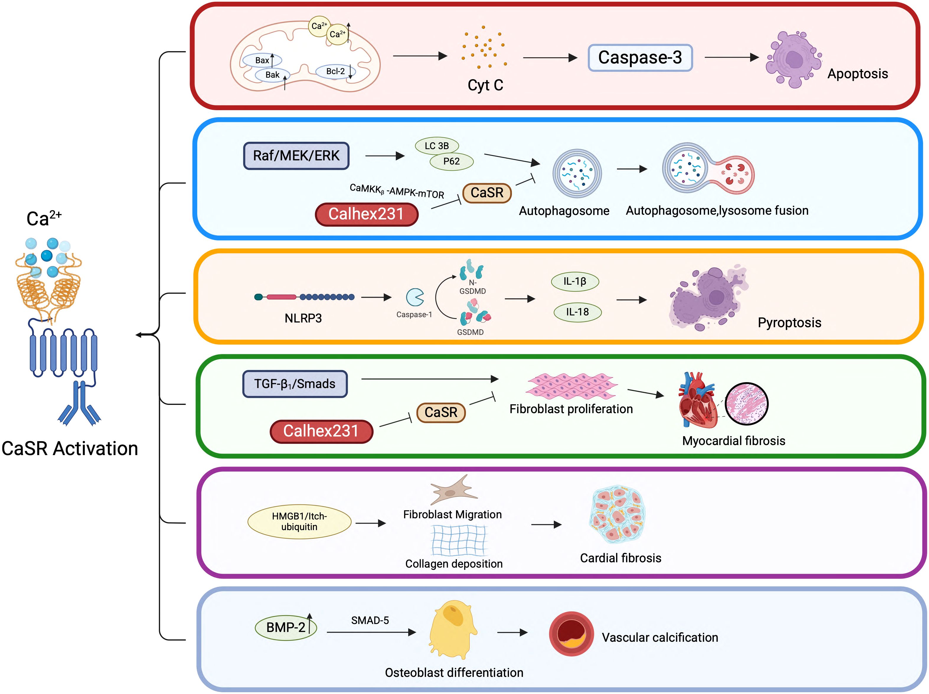 CaSR is expressed on the surface of various cells/tissues, whereby, it functions by activating distinct signaling pathways by sensing Ca2+ concentration in the ECM. The findings of the current review paper revealed significant role of CASR in CVDs, whereby, it modulates various cellular processes such as apoptosis, autophagy, pyroptosis, proliferation, migration and differentiation as depicted in the Figure 5. Moreover, intracellular signaling pathways mediated by CaSR can lead to inflammation and fibrosis. Notably, CaSR has demonstrated its clinical relevance as a potential therapeutic target through a range of regulatory functions in CVDs. Therefore, it is imperative to explore specific mechanisms of CaSR function in CVDs and develop novel therapeutic strategies targeting CaSR in future.