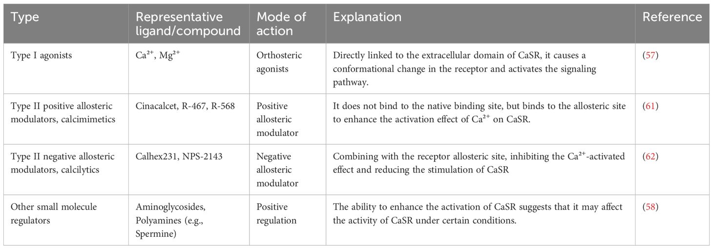 Studies have shown that mitochondria exhibit obvious Ca2+ overload under hypoxic injury conditions, causing mitochondrial damage that eventually leads to apoptosis and necrosis of cardiomyocytes (52–54). The inhibition of Ca2+ within mitochondria, thus, effectively reduces cardiomyocyte apoptosis in response to hypoxic injury (55). This suggests that CaSR not only participates in myocardial injury through the ER pathway, but also plays a significant role in cardiomyocytes apoptosis induced by hypertension by regulating mitochondrial dynamics. The research by Lu et al. indicates that after establishing the hypoxia/reoxygenation (H/Re) model, the increase in extracellular Ca2+ concentration induces its binding to the CaSR and activates the phospholipase C (PLC) signaling pathway, leading to IP3 accumulation and triggering the release of Ca2+ from the sarcoplasmic reticulum (SR) into mitochondria and its concomitant uptake into the mitochondria (16, 56). Activation of CaSR results in mitochondrial dysregulation and aggregation, manifesting as swelling, disarray of cristae, and loss of normal striations. The CaSR is activated by Ca2+ and Mg2+ (type I activators) (57, 58), which are present in extracellular fluid. In addition to endogenous ions, there are also some exogenous small molecule regulators that can act as regulatory factors for CaSR. The calcimimetic agents such as Calhex231 can inhibit the effect of Ca2+ on CaSR (59–62). In the presence of type I CaSR activators, the specific inhibitor of CaSR, Calhex 231, can inhibit CaSR activation induced by Ca2+ by binding to the 7TM domain of CaSR that is distant from the Ca2+ orthosteric binding site (63). The action modes of different types of ligands on CaSR are illustrated in Table 1.