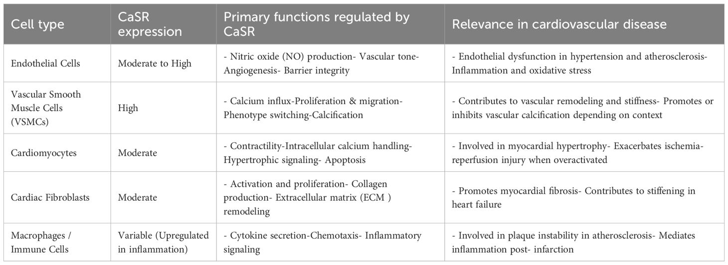 CaSR is expressed in various cardiovascular cell types, where it plays a significant role in modulating key cellular functions that contribute to both physiological regulation and disease progression. Its activity in endothelial cells, VSMCs, cardiomyocytes, and fibroblasts influences processes such as contractility, inflammation, remodeling, and calcification, as detailed below.