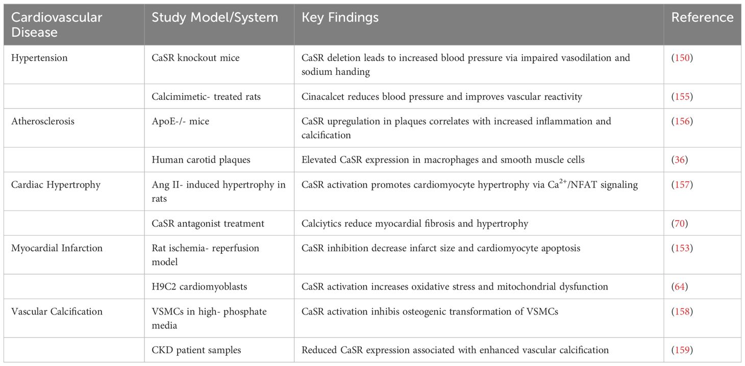Comprehensively, CaSR contributes to the pathophysiology of multiple CVDs through diverse, cell-specific mechanisms (36, 64, 70, 150, 153, 155–159), as depicted in Table 3. Understanding these disease-specific roles is essential for developing CaSR-targeted therapies tailored to specific cardiovascular problems.