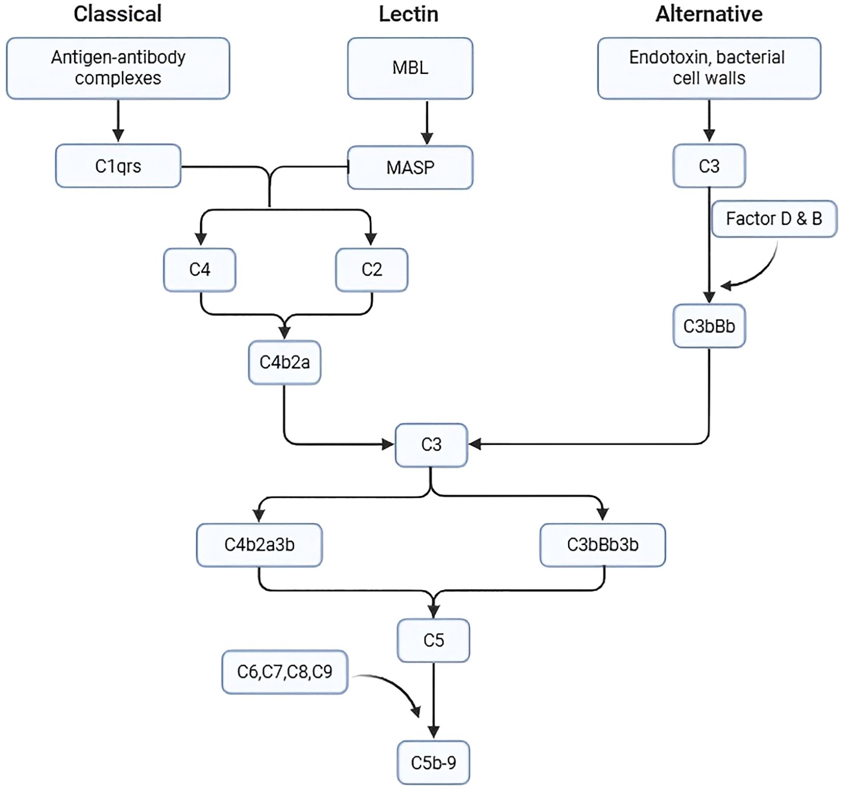 CAD is an AIHA driven by cold IgM antibodies; it is characterized by complement C3b-mediated hemolysis. IgM binds to erythrocytes at lower temperatures—typically in peripheral circulation, such as the extremities—triggering recruitment of the C1 complex and activation of the classical complement pathway (4). Once C1 is activated, it cleaves C4 and C2 to form C3 convertase (C4b2a), which subsequently cleaves C3 into C3a (a soluble anaphylatoxin) and C3b (which binds to cell membranes). This biphasic pattern of complement activation has also been observed in human serum sickness nephritis: the early phase (within 72 hours) is predominantly classical pathway–driven, while the late phase (>7 days) involves significant amplification through the alternative pathway (5). After activation of the classical pathway, the alternative pathway can be amplified to produce more C3b (Figure 4). Erythrocytes opsonized with C3b are cleared by the reticuloendothelial system, primarily in the liver, via phagocytosis by monocytes, macrophages, and neutrophils, resulting in extravascular hemolysis. C3b can also act as a C5 convertase, cleaving C5, which further binds to C6, C7, C8, and C9 to form a MAC, resulting in intravascular hemolysis.