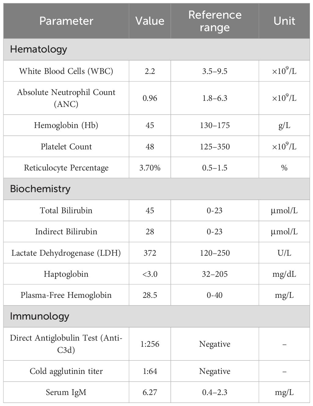 Autoimmune hemolytic anemia (AIHA) is a heterogeneous group of hemolytic anemias that are mediated by autoantibodies directed against one or more self-membrane antigens on erythrocytes. Based on the thermodynamic properties and optimal reactivity temperature of the causative autoantibodies, AIHA is classified into three distinct subtypes: warm AIHA, cold AIHA, and mixed-type AIHA. Among all AIHA cases, 15%–20% are cold AIHA, which can be further classified into cold agglutinin disease (CAD) and cold agglutinin syndrome (CAS). CAD is driven by monoclonal IgM binding to red blood cells, leading to activation of the complement pathway to produce C3b, which opsonizes red blood cells, inducing their destruction by phagocytes in the liver and causing extravascular hemolysis; downstream C5 may also be activated, thereby inducing membrane attack complex (MAC) formation and intravascular hemolysis (1). Glucocorticoids have poor efficacy in CAD. Although B cell-targeted therapies—including rituximab monotherapy or combination therapy with bendamustine or fludarabine—have improved efficacy, rituximab monotherapy is associated with high relapse rates. Combination treatment with bendamustine is accompanied by serious risks of agranulocytosis and infections, whereas combination treatment with fludarabine induces potent immunosuppression with a higher incidence of malignancy (2). In addition, there have been limited case reports of the use of bortezomib and Bruton’s tyrosine kinase inhibitors. Recently, complement inhibitors, including sutimlimab (which targets C1s) and pegcetacoplan (which targets C3), have demonstrated promising efficacy, but they have not yet been marketed in China. Iptacopan is a potent and selective oral complement factor B inhibitor that inhibits C3b production, thereby reducing C3b deposition on red blood cells and MAC formation, consequently controlling both intravascular and extravascular hemolysis (3). Herein, we present a case of CAD with lymphoplasmacytic lymphoma (MYD88 L265P mutation-negative) diagnosed by bone marrow biopsy that demonstrated a poor response to bendamustine in combination with rituximab and zanubrutinib. After switching to iptacopan combined with cyclophosphamide and dexamethasone, hemolysis was controlled and anemia improved.