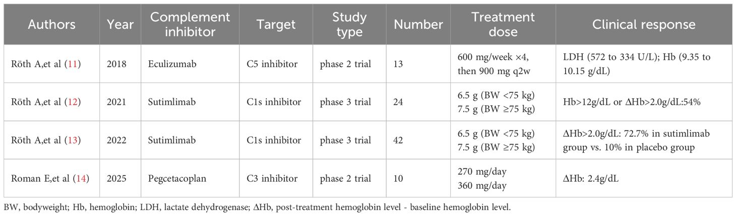 Because CAD hemolysis is mediated by C3b, complement inhibitors have become another treatment option for CAD. An open-label phase 2 study shows that eculizumab significantly reduced hemolysis and transfusion requirement in patients with CAD (11). Two recent prospective trials demonstrated that sutimlimab, a C1s inhibitor targeting the classical complement pathway, is highly effective and safe in CAD/CAS. It induced rapid responses in 54%–73% of patients, with a mean hemoglobin increase of 26 g/L and significant improvement in quality of life, particularly in Functional Assessment of Chronic Illness Therapy–Fatigue scores. The therapeutic effect was sustained with continued treatment, but hemolytic anemia could relapse within weeks of discontinuation (12, 13). Gavriilaki et al. reported an elderly patient with warm autoimmune hemolytic anemia (wAIHA) refractory to three prior therapies. Pegcetacoplan treatment led to a significant hemoglobin (Hb) increase from 53 g/L to 107 g/L (14). In an open-label phase 2 study of the C3 inhibitor pegcetacoplan in CAD and mAIHA, patients were randomized to receive either 270 mg/day or 360 mg/day of pegcetacoplan for up to 48 weeks. Among 30 patients screened (24 receiving ≥1 dose), 10 completed 270- and 360-mg daily dosing in CAD (5 patients each), whereas 4 (270 mg) and 3 (360 mg) participants completed dosing in wAIHA. The median (interquartile range) change from baseline Hb for the CAD and wAIHA total groups was 2.4 and 1.7 g/dL, respectively (15) (Table 2). Complement inhibition has increasingly become the standard of care for CAD.