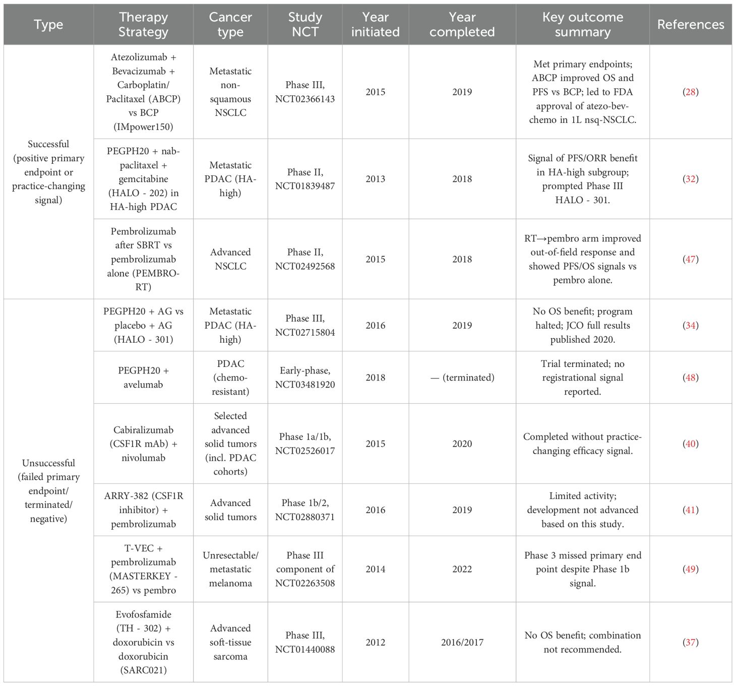 Table 1. Clinical studies of stroma/ECM or TME-modulating strategies (split by outcome) with cancer type and timeline.