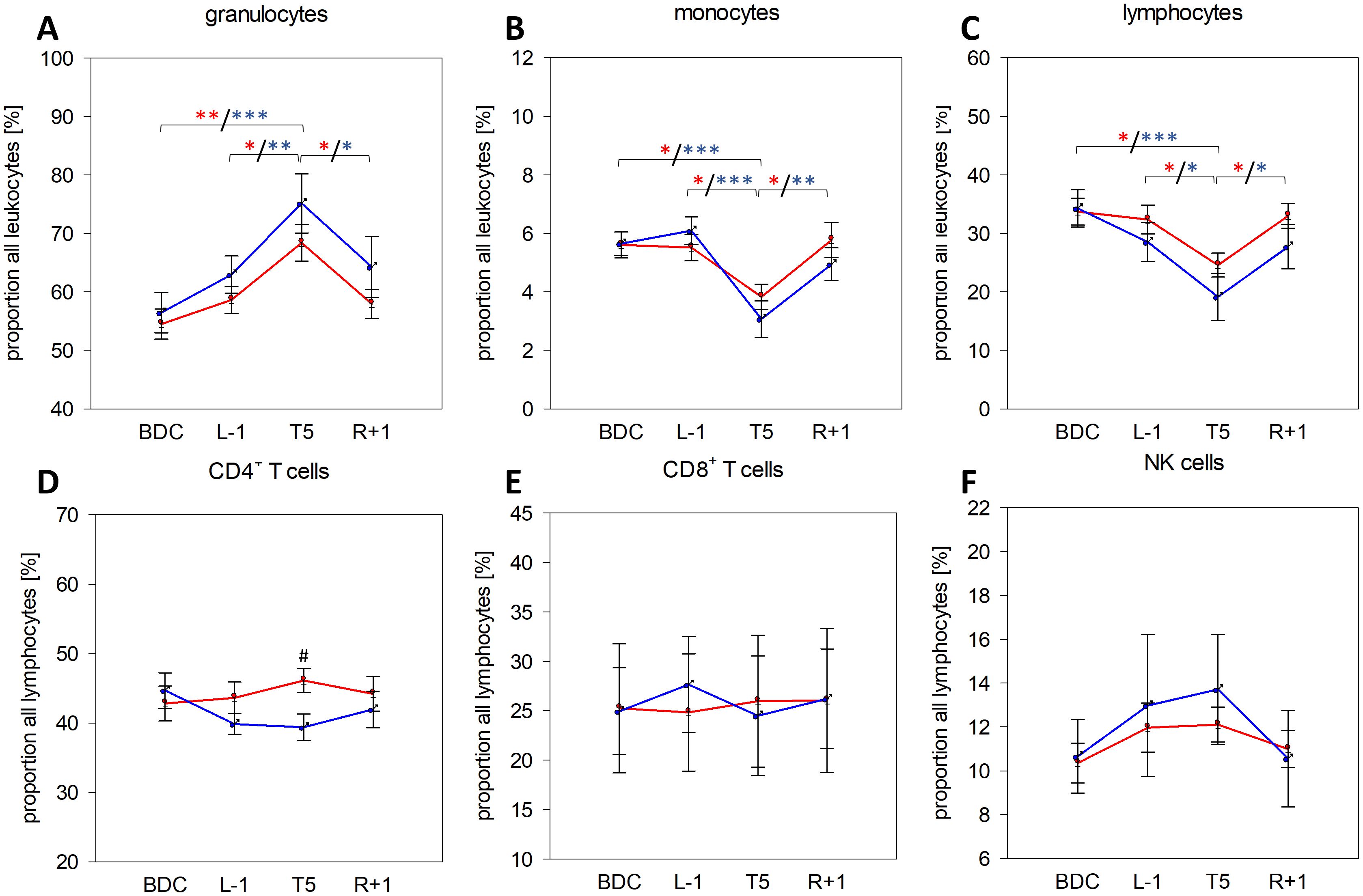 Figure 2. Proportions of granulocytes (A), monocytes (B), and lymphocytes (C) among all leukocytes in whole blood as well as of CD4+ T cells (D), CD8+ T cells (E), and NK cells (F) among all lymphocytes at the respective sample collection time points using IMK Multitest. Plots represent mean values ± SD in women (red, n=14 (BDC, L-1, T5), n=13 (R+1)) and men (blue, n=9 (BDC, T5), n=8 (L-1), n=6 (R+1)). Differences between groups were calculated using unpaired two-tailed Student’s t test (#). Differences between study time points within the same group were calculated by one-way repeated measures ANOVA (*) followed by post-hoc Holm–Sidak test, whereby differences in the female group are indicated in red and in the male group in blue asterisks. #/*P <.05, **P <.01, ***P <.001.