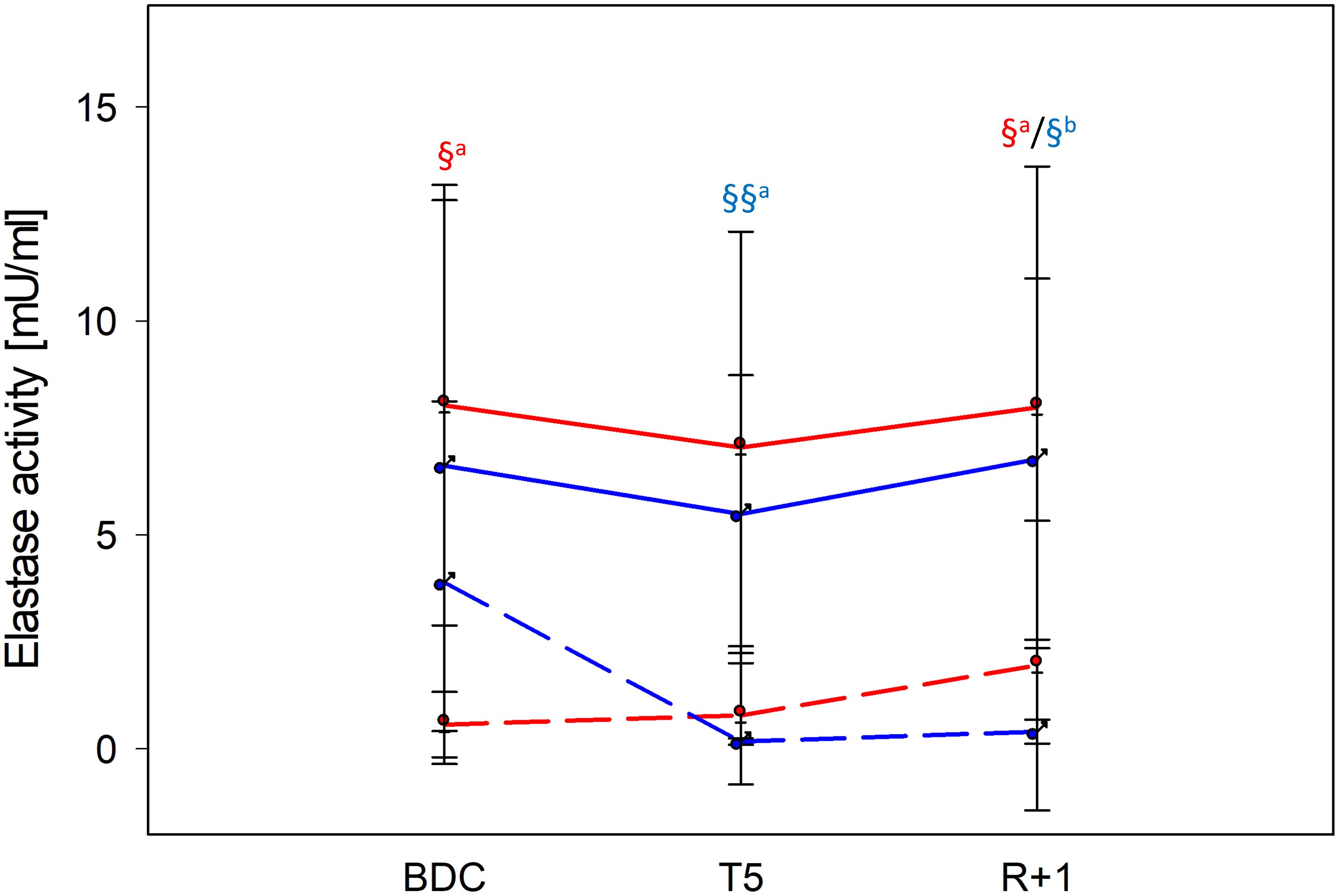 Figure 3. NETosis intensity at time points BDC, T5 and R+1 quantified by neutrophil elastase activity [mU/ml]. Neutrophils were incubated for 3 h with phorbol 12-myristate 13-acetate (PMA) for NETosis induction. Values show mean ± SD for women (red lines, n=9) and men (blue lines, n=5). Differences between negative control (dashed lines) and PMA (filled lines) within the same group were calculated by one-way ANOVA followed by post-hoc Tukey test (a) or Holm–Sidak (b) test. §P < 0.05, §§P < 0.01.