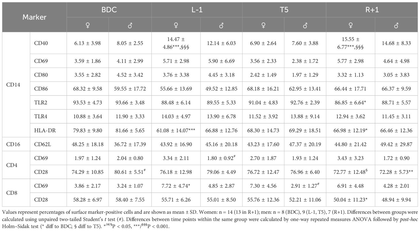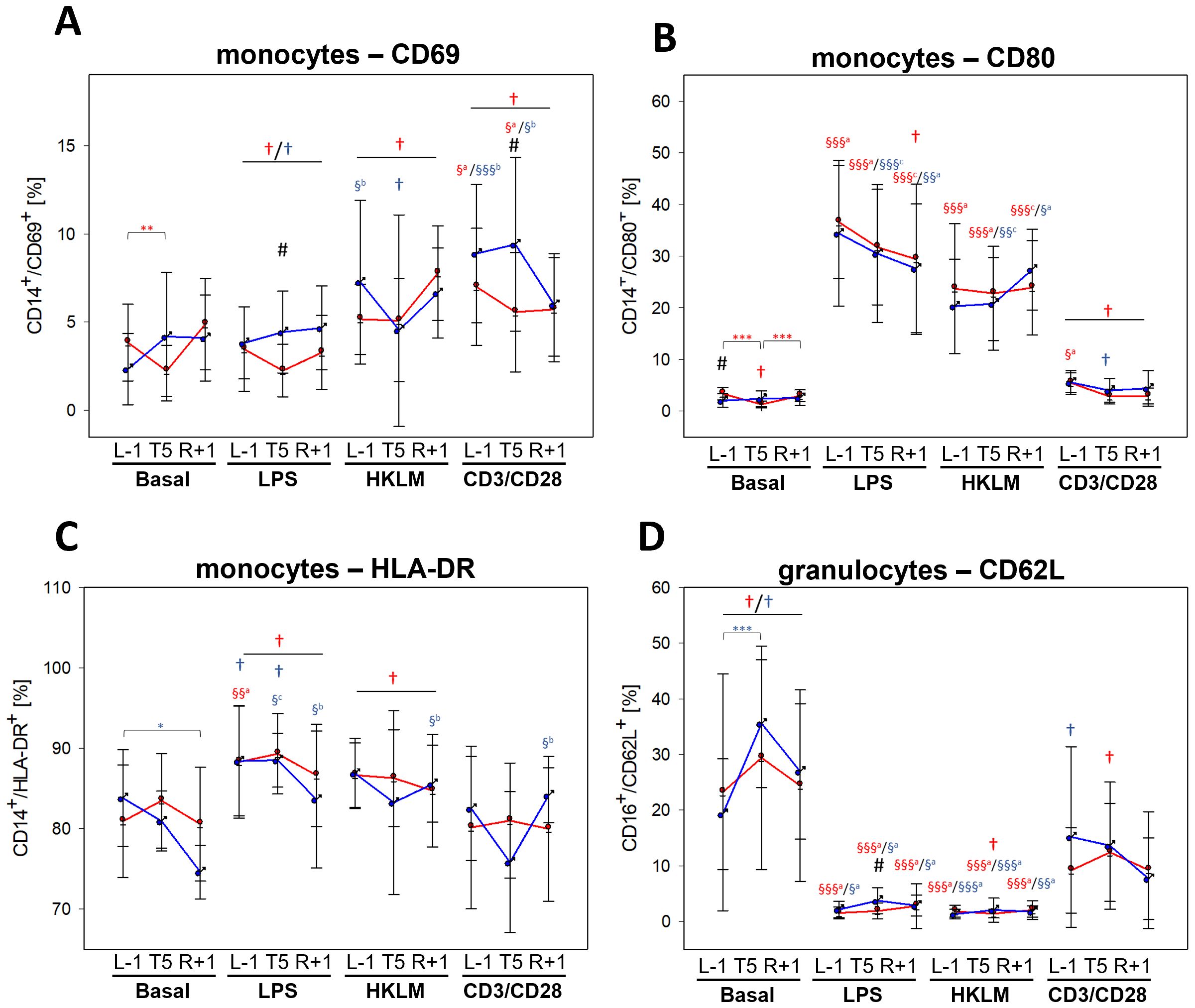 Figure 4. Cell surface expression of cell activation markers CD69 (A), CD80 (B), and HLA-DR (C) on CD14+ monocytes and CD62L on CD16+ granulocytes (D) at L-1, T5, and R+1 time points after 6-h whole-blood incubation with negative control (basal), LPS, HKLM, or CD3/CD28 activator. Values represent percentages of surface marker positive cells and are shown as mean ± SD. Females: n = 14 (13 in R+1); males: n = 9 (L-1, T5), 7 (R+1). Differences between groups were calculated using an unpaired two-tailed Student’s t test (#). Differences between antigen and basal within the same group and time point were calculated by one-way ANOVA (§) followed by post-hoc Tukey test (a), Holm–Sidak test (b) or Dunn’s method (c). Differences between time points within the same group and antigen were calculated by RM one-way ANOVA (*) as well as differences to BDC (†) followed by Holm–Sidak test. xxxP < 0.05, xxP < 0.01, xP < 0.001.