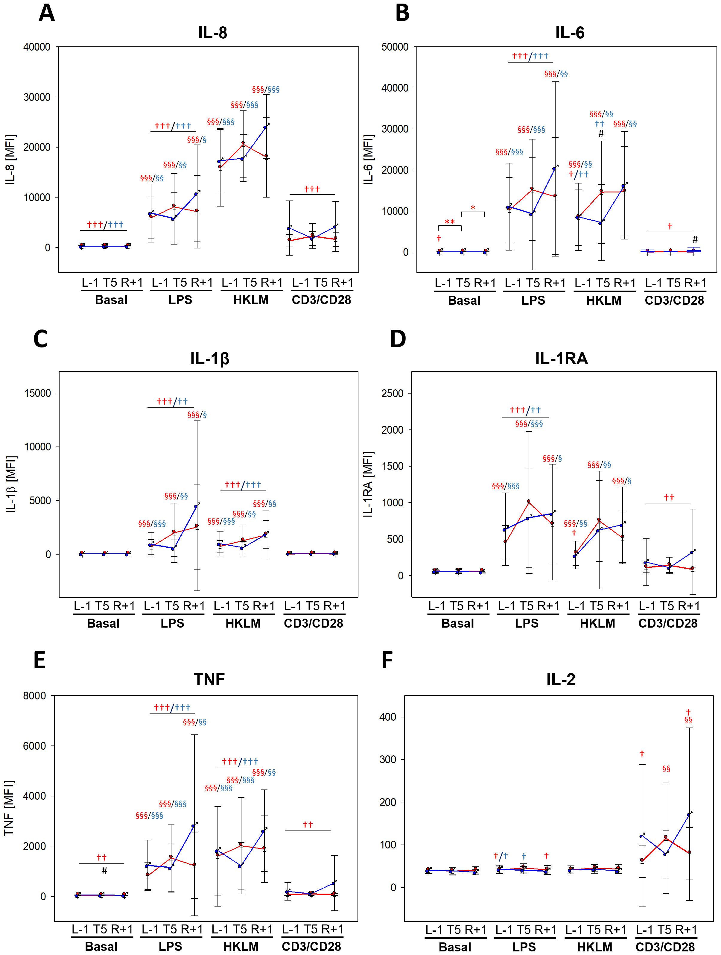 Figure 5. Cytokine levels at time points L-1, T5, and R+1 after 6 h of whole-blood incubation with negative control (basal), LPS, HKLM, or CD3/CD28 activator. Values represent MFIs (mean fluorescent intensities) of the cytokines IL-6, IL-8, IL-1β, IL-1RA, TNF, and IL-2 and are shown as mean ± SD. Women: n = 14 (13 at R+1); men: n = 9 (6 at R+1). Differences between groups were calculated using unpaired two-tailed Student’s t test (#). Differences between antigen and basal within the same group were calculated by one-way ANOVA followed by Tukey test (§). Differences between time points within the same group and antigen were calculated by RM one-way ANOVA (*) as well as differences to BDC (†) followed by Holm–Sidak test. xP < 0.05, xxP < 0.01, xxxP < 0.001.