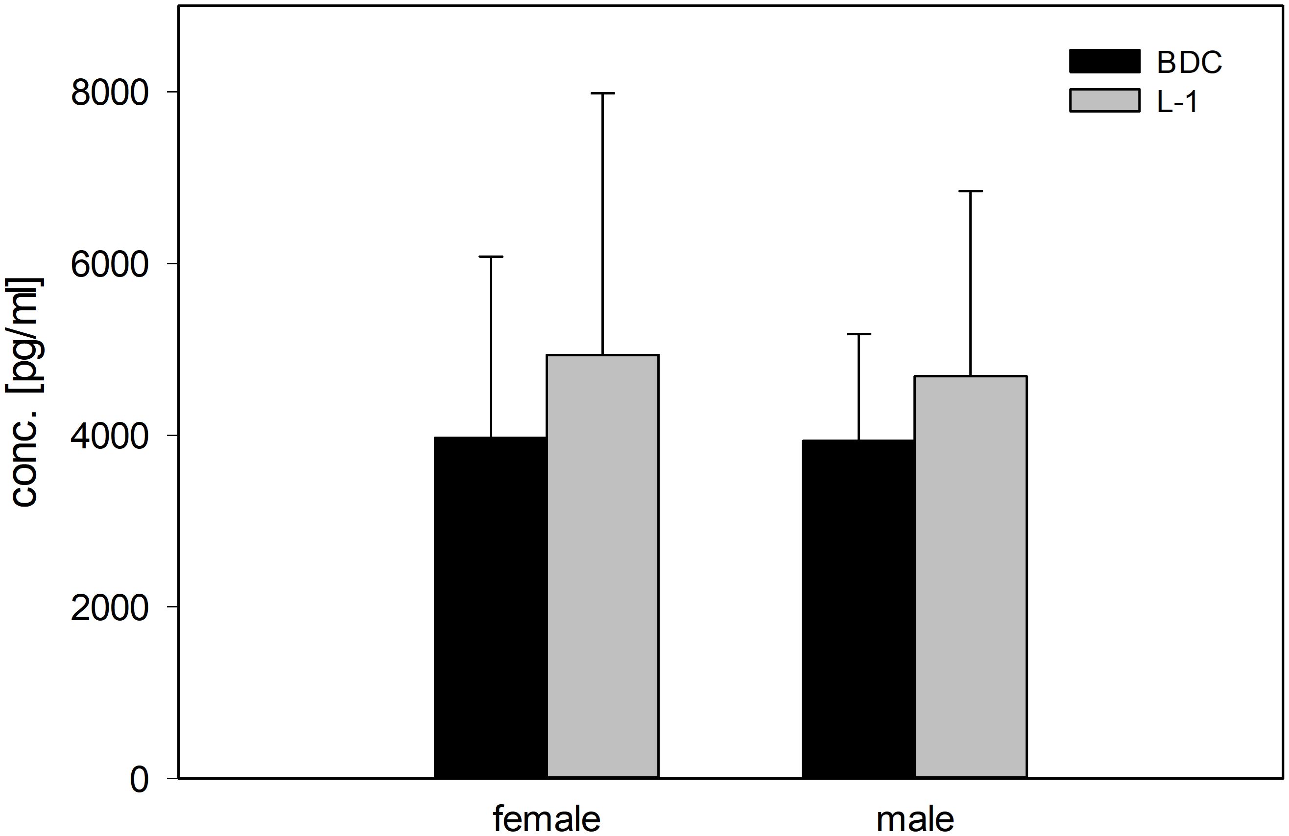 Figure 6. Concentrations (pg/ml) of the stress hormone cortisol (morning values) in saliva in female and male study participants at BDC (black bars) and L-1 time points (grey bars).