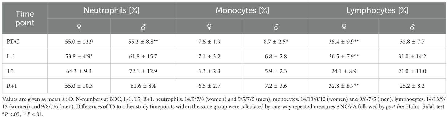 In order to comprehend immune functional alterations caused by acute gravitational stress in dependence of biological sex, blood cell count, as well as leukocyte subset analysis, was performed at two pre- (BDC, L-1) and two post-flight (T5, R+1) time points. PF induced in both groups an increase in white blood cell numbers, reaching statistical significance in women at T5 compared to BDC, L-1 and R+1, but not in men. One day after PF, values remained at higher levels than pre-flight in both groups (Figure 1).