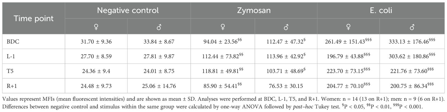 Phagocytic activity was examined by the uptake of fluorochrome-labelled zymosan and E. coli particles. Both particle types were taken up by leukocytes resulting in significant fluorescent signals, with phagocytosis of E. coli particles being more pronounced than that of zymosan particles. Significant differences were neither observed between time points nor between sexes (Table 3).