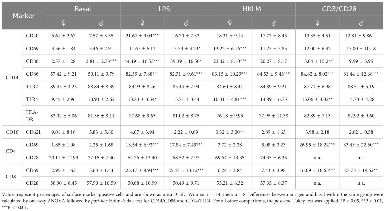 Incubation with the stimuli LPS and HKLM and with CD3/CD28 activation beads resulted at BDC in an upregulated expression of CD40, CD69, CD80, CD86, and TLR4 on the surfaces of monocytes. Expression of TLR2 and HLA-DR remained constant (Table 5, first section, CD14+ monocytes). The surface marker CD62L displayed intense shedding due to the incubation procedure itself, which is seen between the negative control (immediate measurement after blood draw) and basal (incubation for 6 h at 37°C). Antigen stimulation led to a further decrease of CD62L levels; however, differences to basal levels were too low to reach statistical significance (Table 5, second section, CD16+ granulocytes). CD69 was strongly induced on the surfaces of both T-cell subsets by LPS and CD3/CD28 activation beads, but CD28 expression was unaffected (Table 5, third section, CD4+ and CD8+ T cells). Surface activation marker expression on the distinct leukocyte subsets did not show sex-specific reaction patterns.