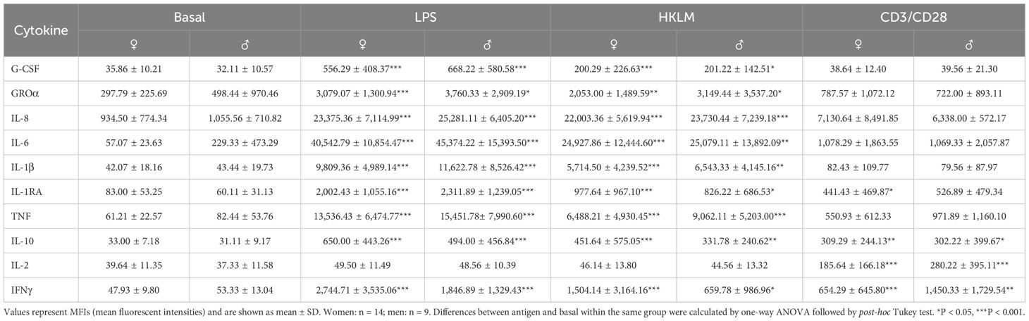 Cytokine quantification after stimulation with LPS, HKLM, and CD3/CD28 at BDC showed stimulus-specific reactions by respective leukocyte subsets. Incubation with LPS and HKLM resulted in significant increases in G-CSF, GROα, and IL-8, all of which are involved in granulocyte development and function. Monocyte activation was reflected by increased secretion of IL-1β and IL-1RA after LPS and HKLM incubation, and higher IL-6 and TNF levels demonstrated general pro-inflammatory immune responses after stimulation. Secretion of IL-10 and IFNγ was likewise increased. Incubation with the CD3/CD28 activator significantly induced secretion of the T-cell specific cytokines IL-2 and IFNγ as well as of IL-10. Moreover, CD3/CD28 activation bead stimulation resulted in increased levels of IL-8, IL-6, IL-1RA, and TNF, but without reaching statistical significance. Cytokine secretion patterns were comparable in women and men (Table 7).